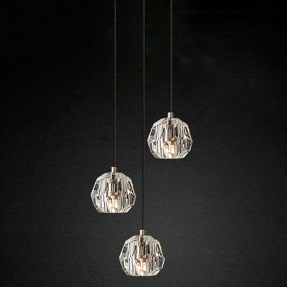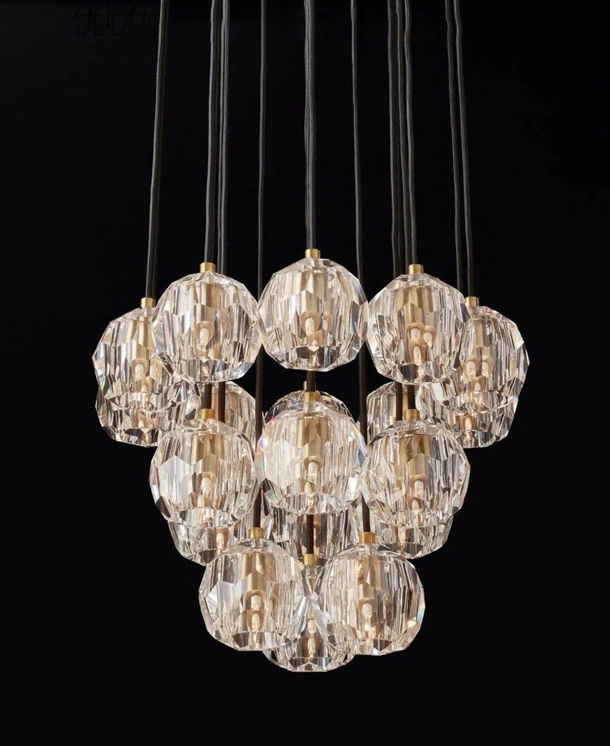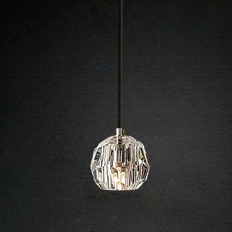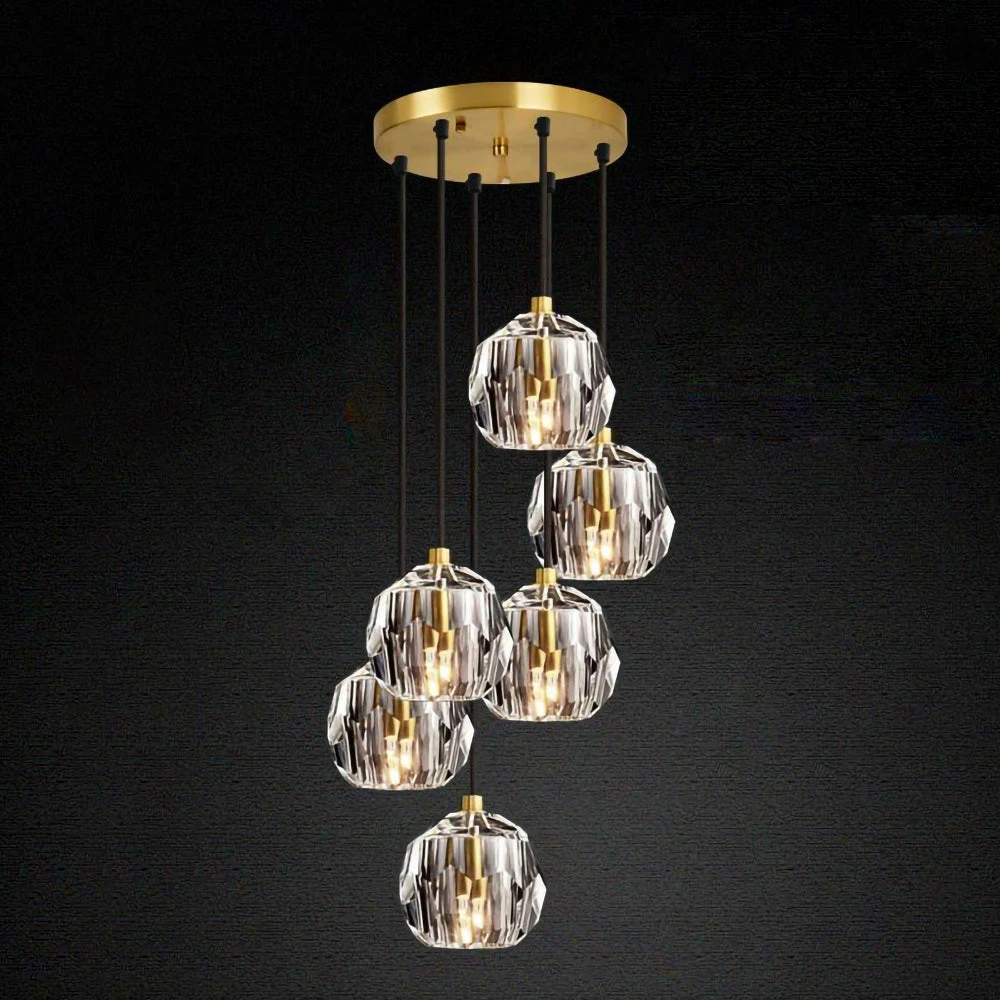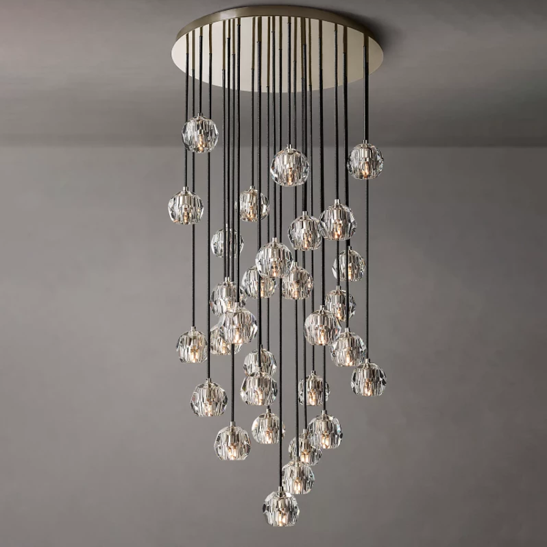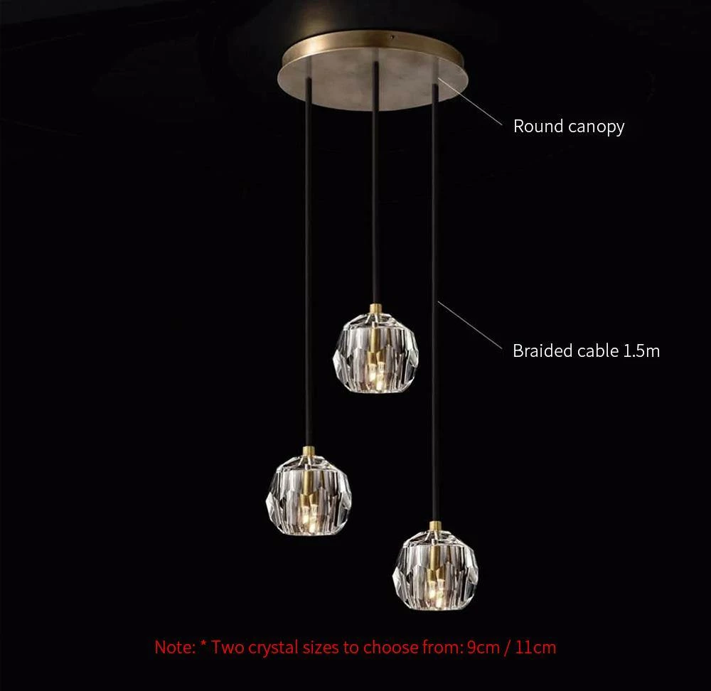Crafted of solid brass and crystal glass, sculptural fixture is a testament to passion for luxe materials and superior craftsmanship. Evoking the minimalist spirit of the 1960s design, each finely faceted sphere is ground and polished by hand to reflect and refract the light.