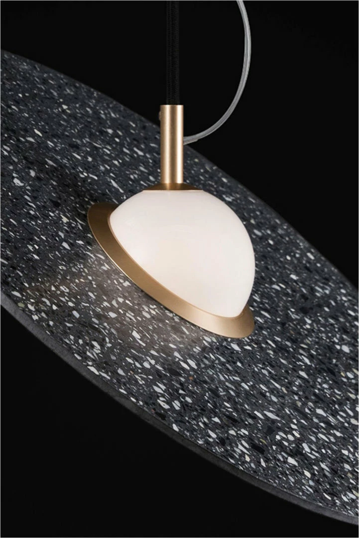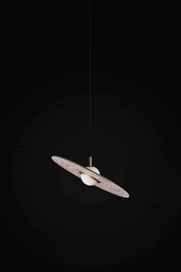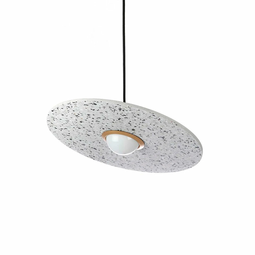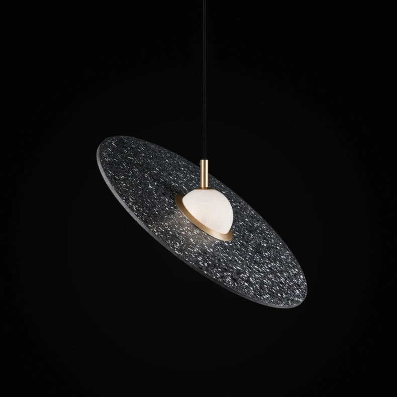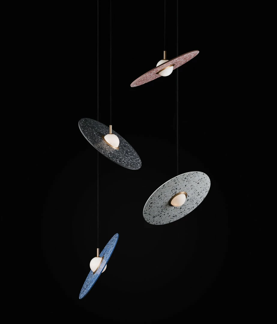 Planet is a pendant light made of terrazzo with details in brass with LED light source. It is available in black, white and red.