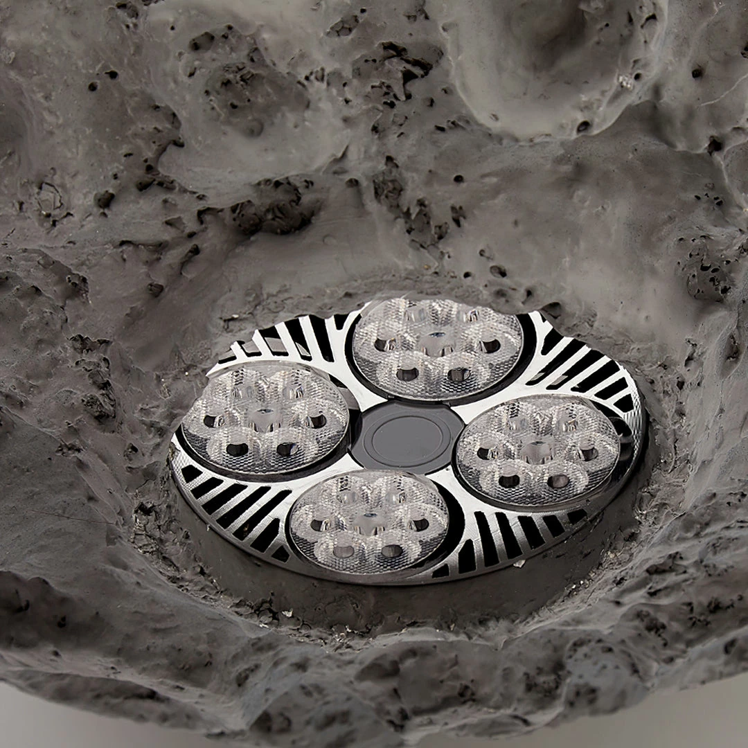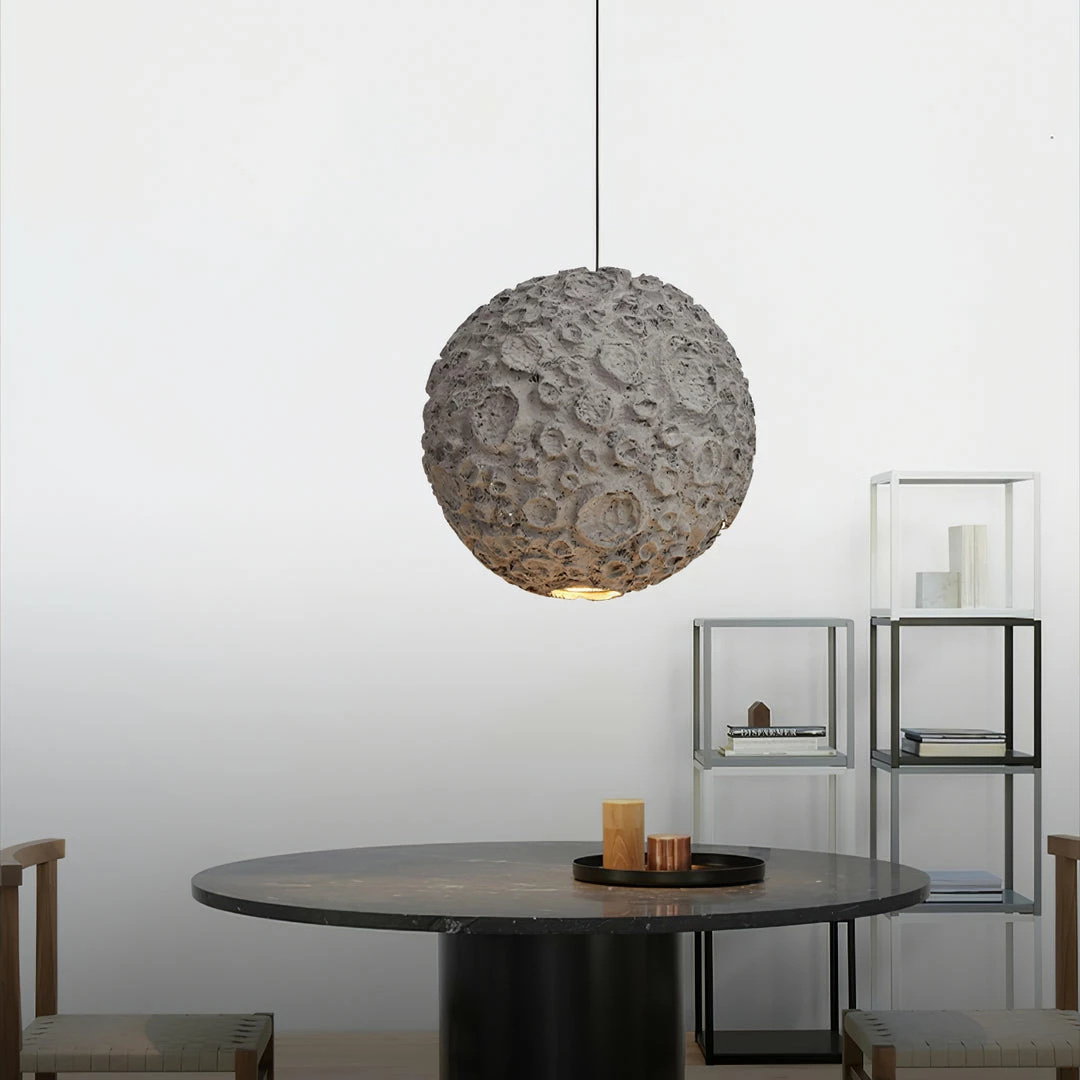 The shape of this pendant lamp refers to the shape of the Earth. Its “core”, the light source, brings it to life. When it’s on, we’ll see a bright, light-filled planet. Its structure – grey, porous and irregular – symbolizes the earth – dry and cracked.