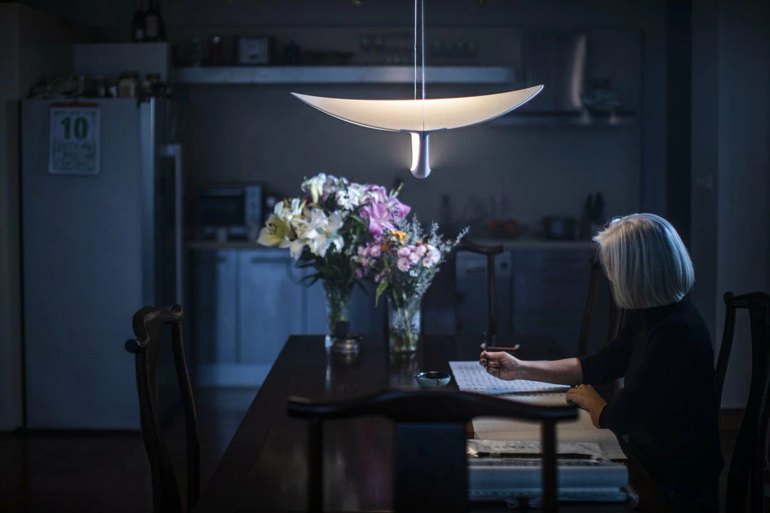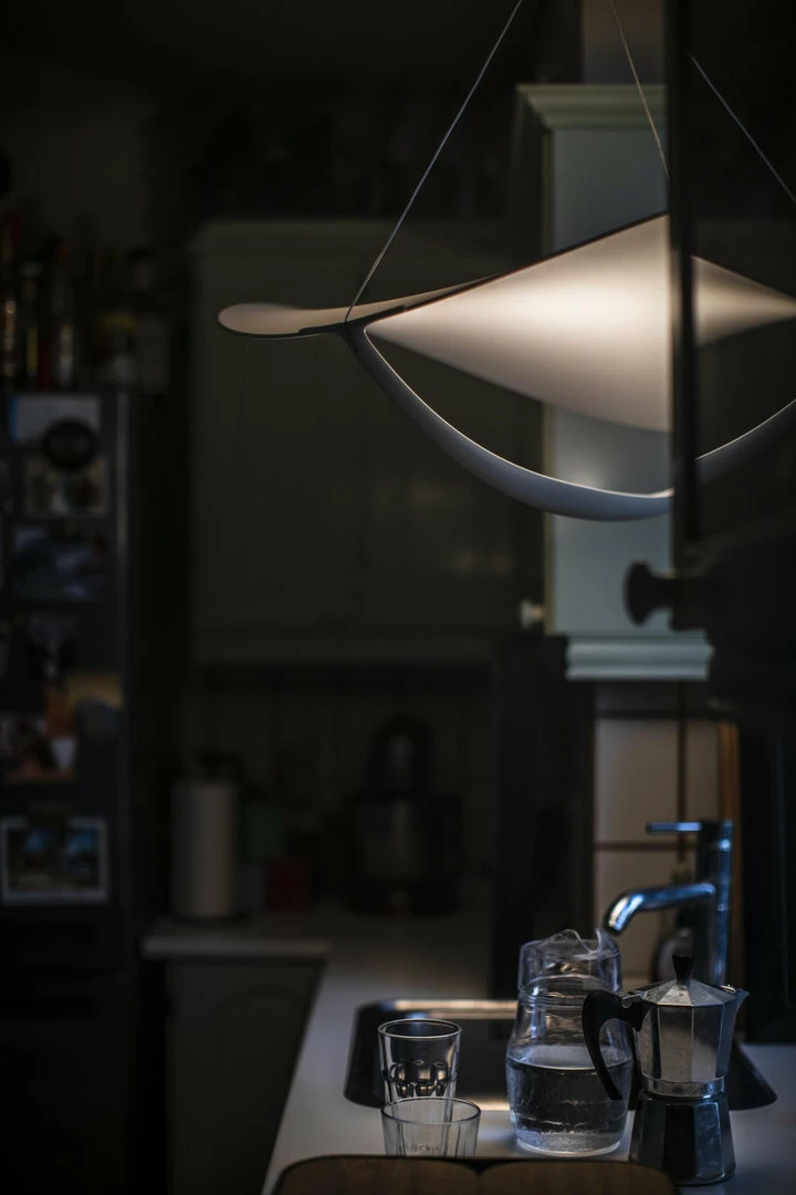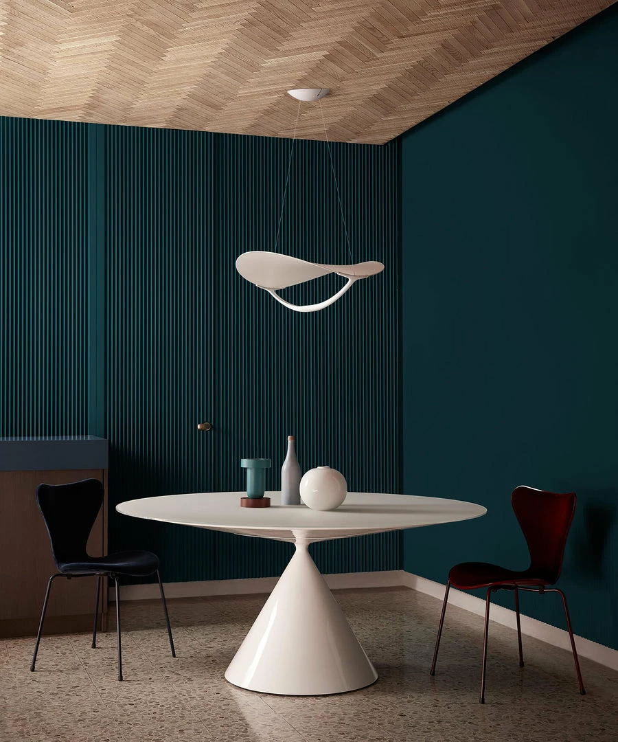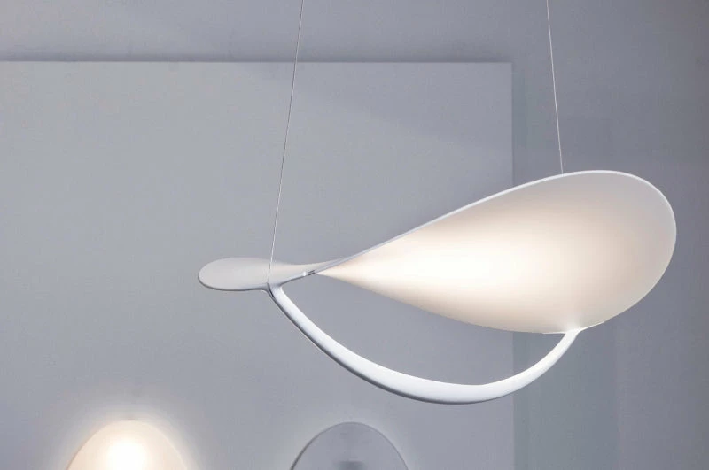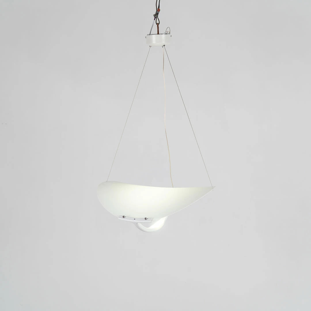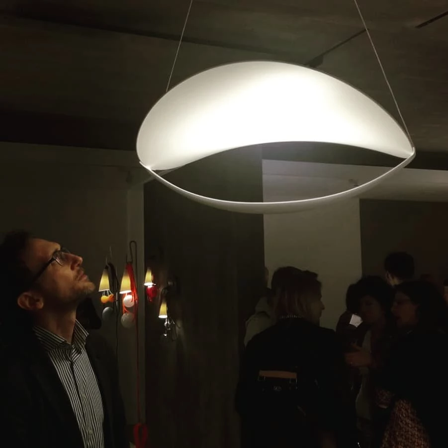 Plena, double lighting LED chandelier: diffused towards the ceiling and reflected on the level below. The dimensions of the PVC diffuser are generous, illuminating environments with a soft and enveloping light and, if placed above a table, never dazzles. The design is particular: the shape is that of a wavy disk with an arch below that acts as a heat sink, and it transmits a feeling of lightness and movement. Plena is suitable for lighting both domestic and commercial spaces. Available in white finish.