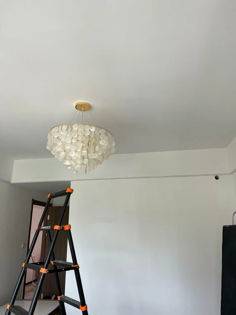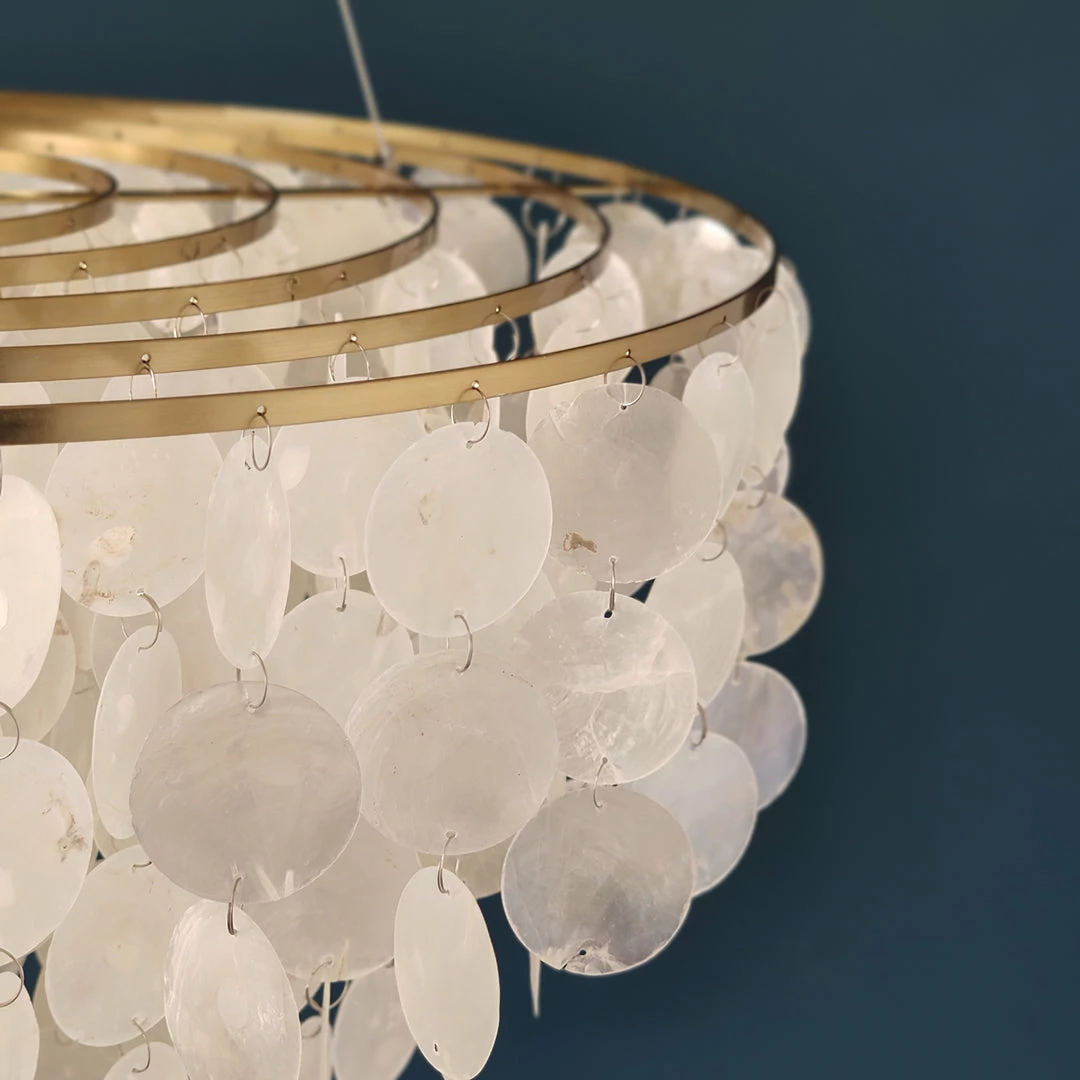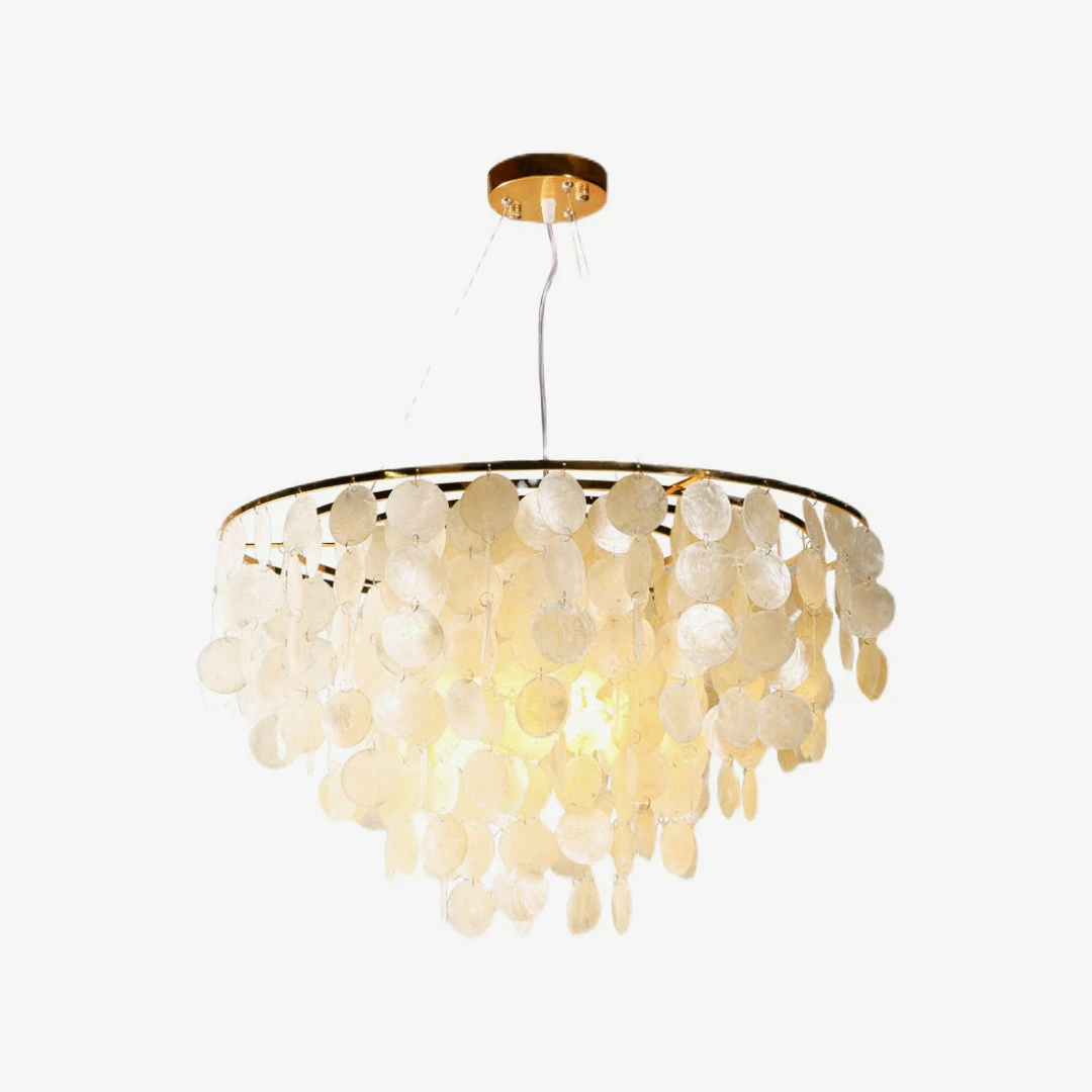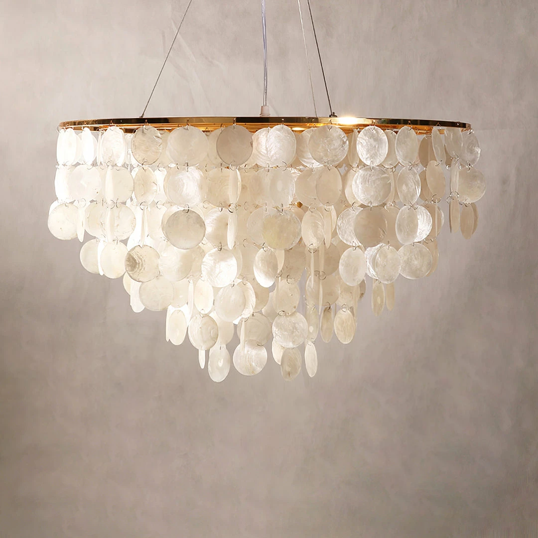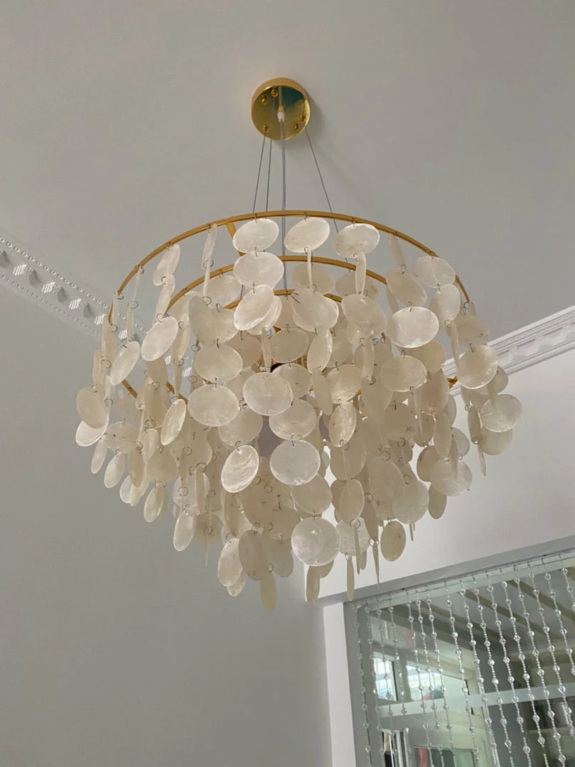 This can be made into a light chandelier Round 5 tier with Gold trim – WOW This beautiful wind chime Chandelier is made of hundreds of shells These Chandelier are a complement to any Room. patio or garden and gives a illusion of being by the sea.