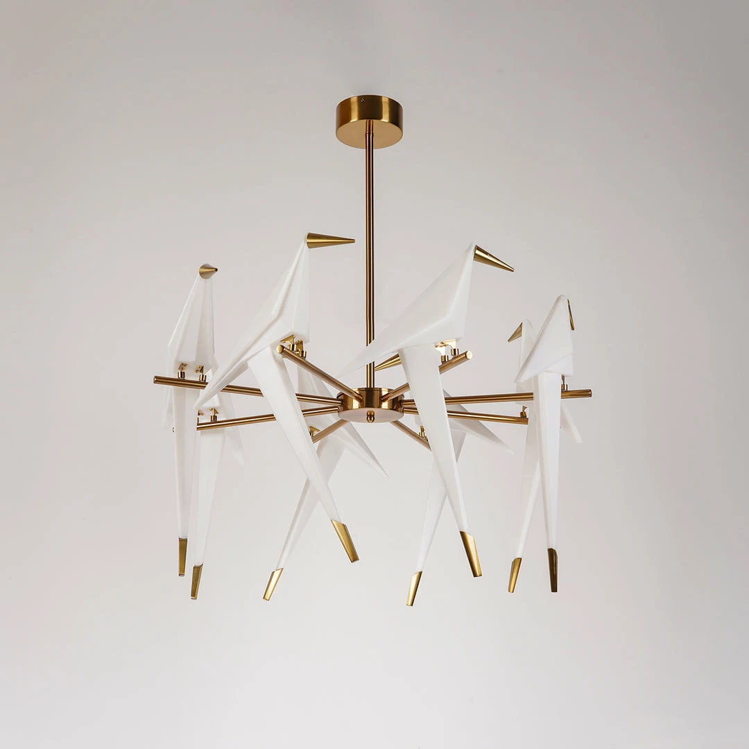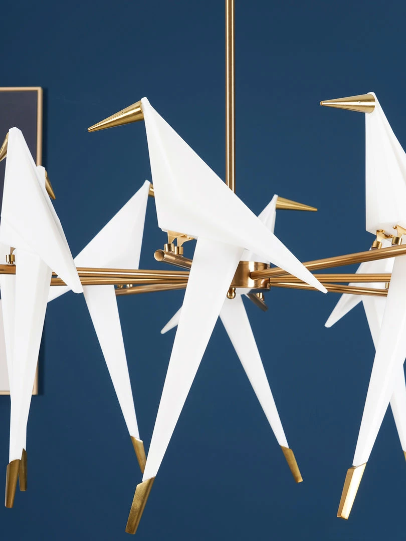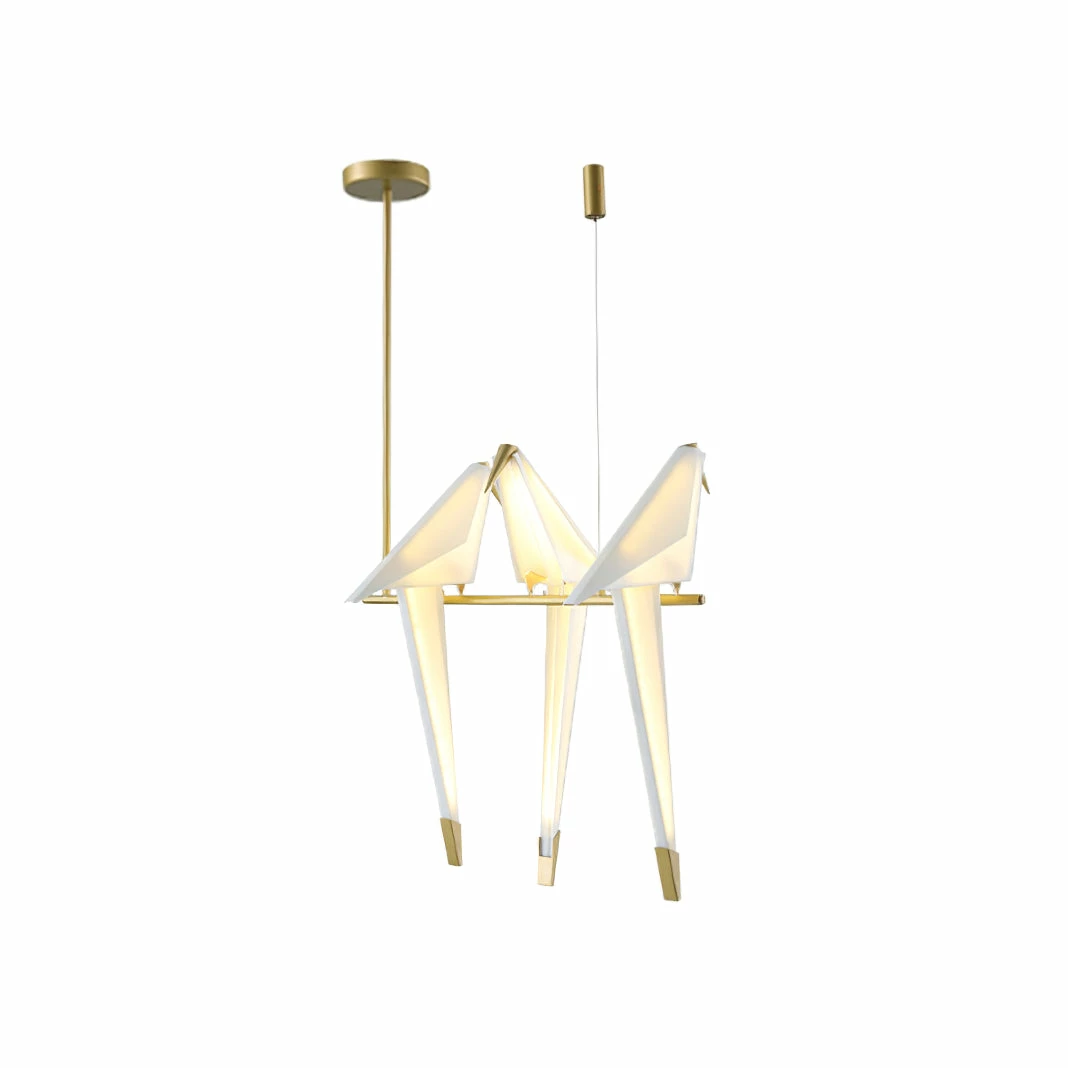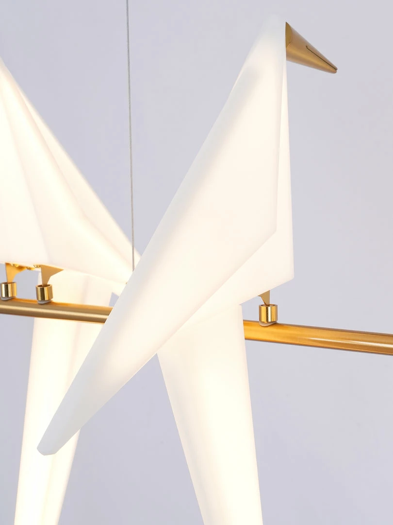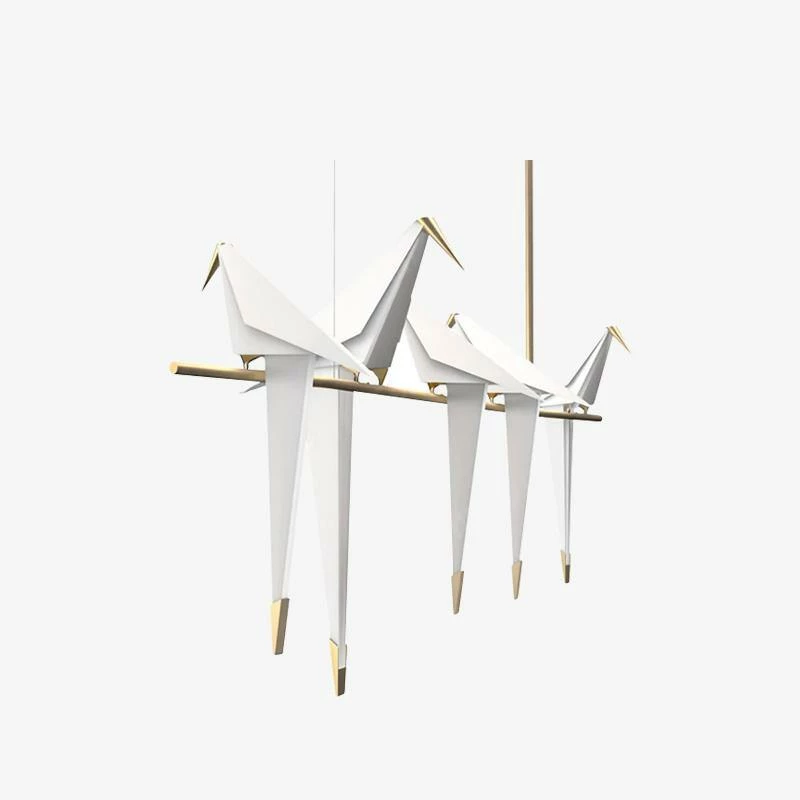A family of sculptural lamps celebrates the beauty and poetry of a bird perched on a branch, rocking darkness away when set in motion. Crafted from the paper in the form of an abstract bird sitting on a branch, these sunlit birds are free to swing when softly touched, gently glowing and bringing along the promise of spring.