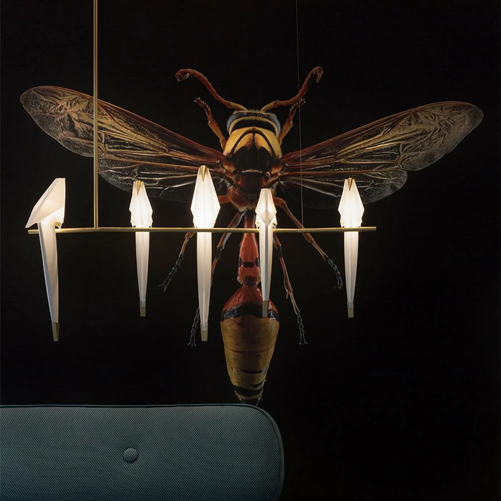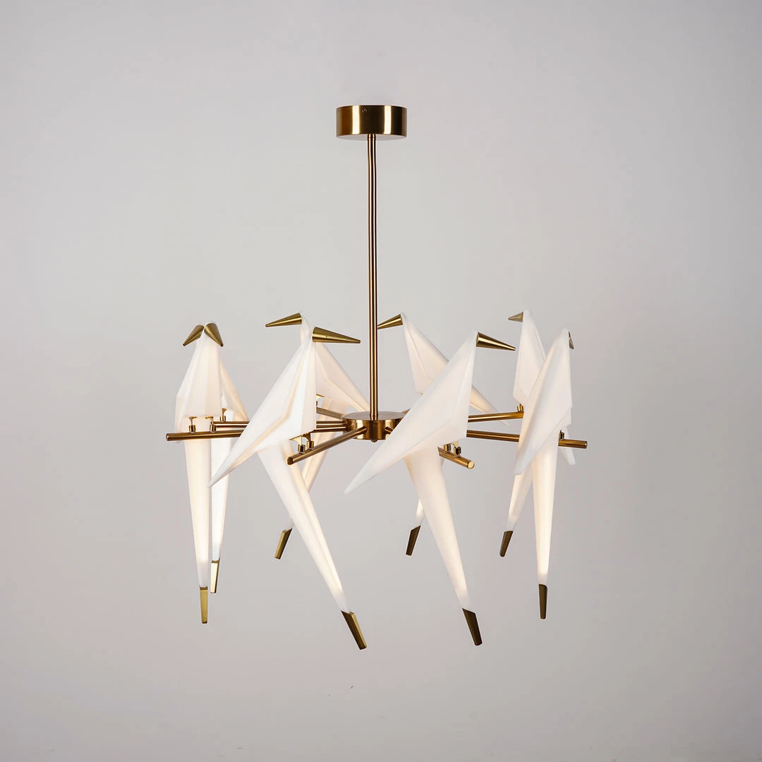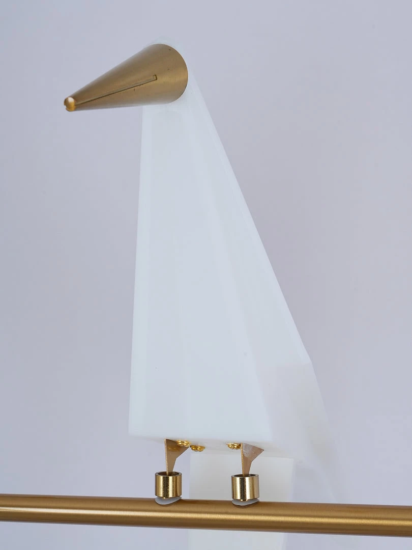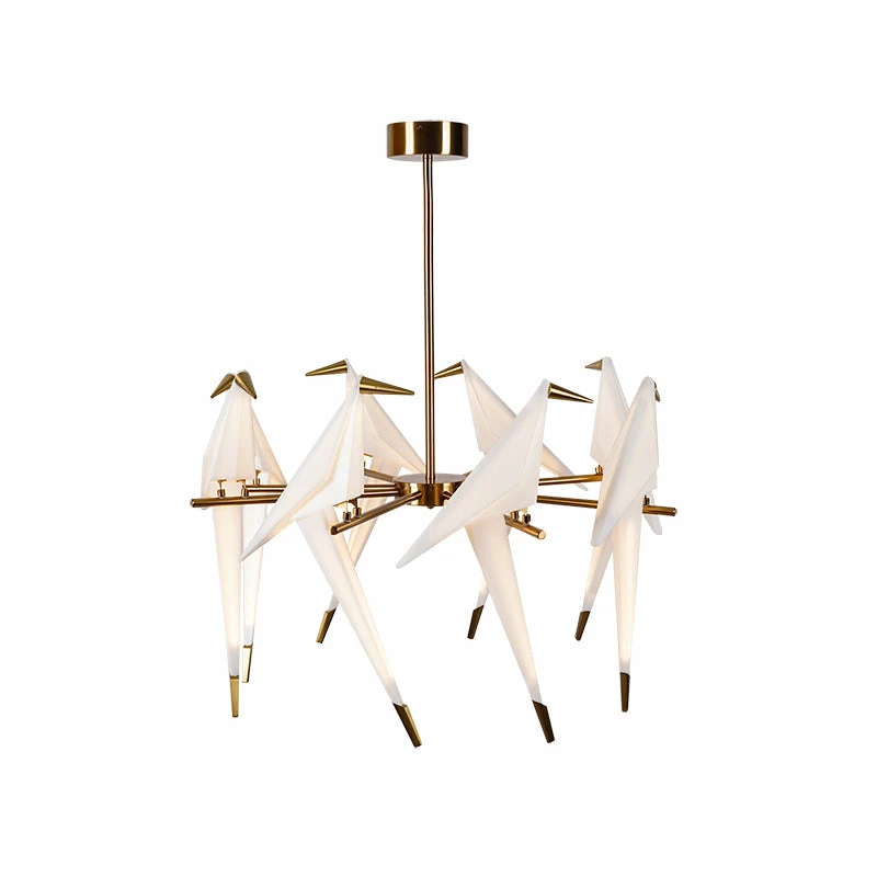 A family of sculptural lamps celebrates the beauty and poetry of a bird perched on a branch, rocking darkness away when set in motion. Crafted from the paper in the form of an abstract bird sitting on a branch, these sunlit birds are free to swing when softly touched, gently glowing and bringing along the promise of spring.