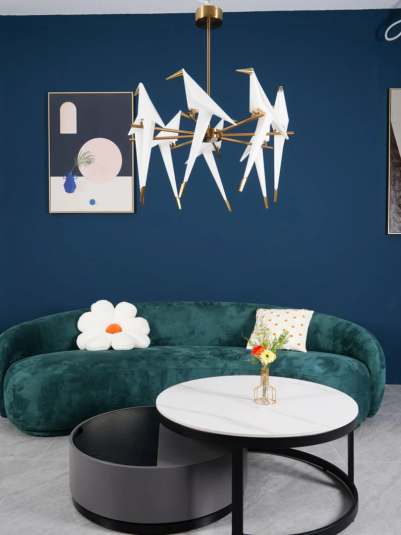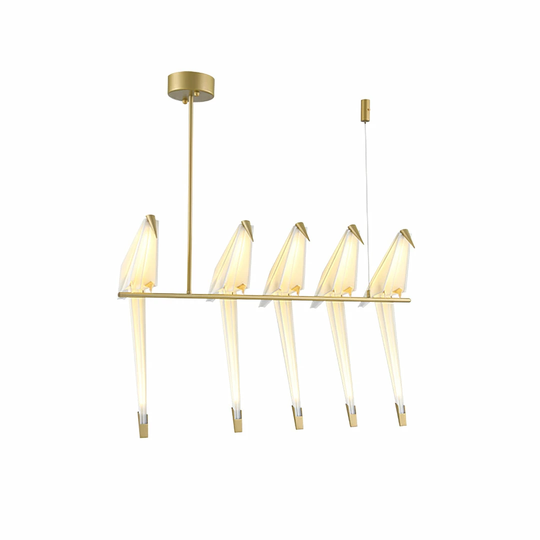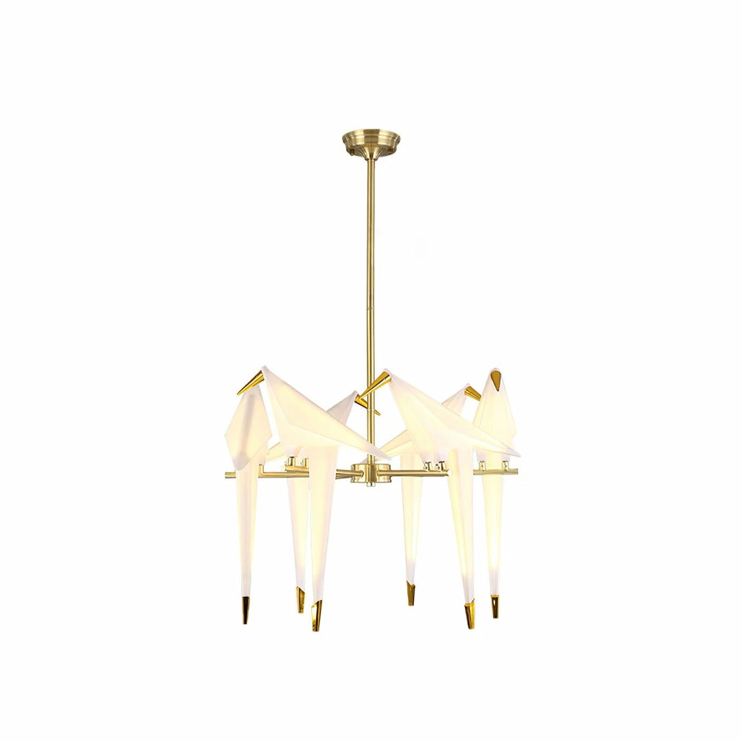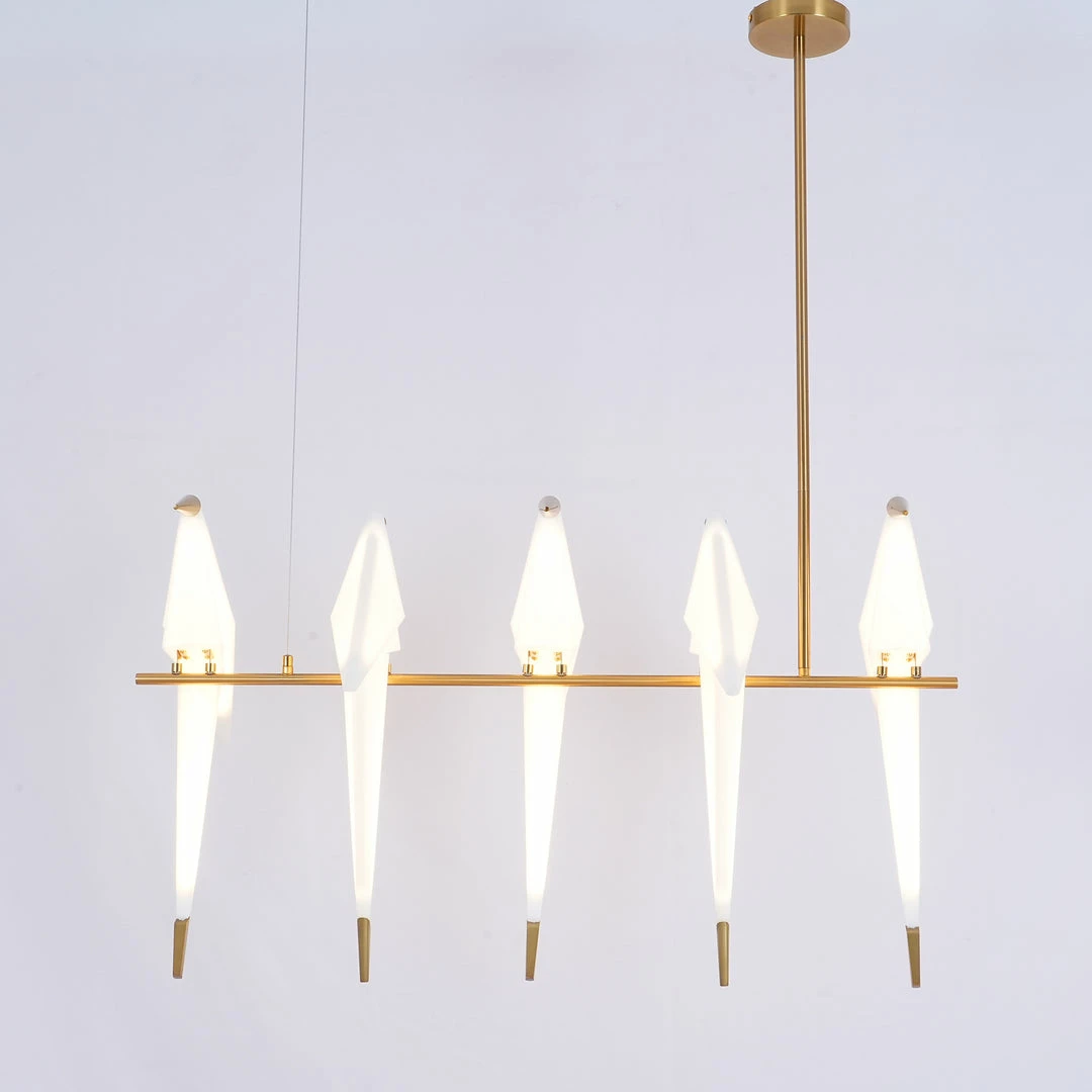 A family of sculptural lamps celebrates the beauty and poetry of a bird perched on a branch, rocking darkness away when set in motion. Crafted from the paper in the form of an abstract bird sitting on a branch, these sunlit birds are free to swing when softly touched, gently glowing and bringing along the promise of spring.
