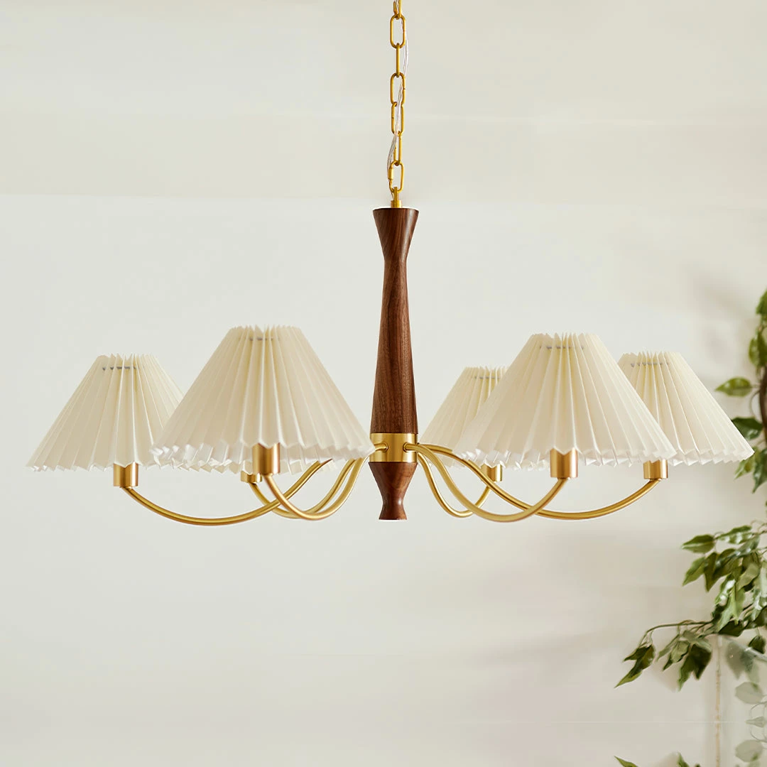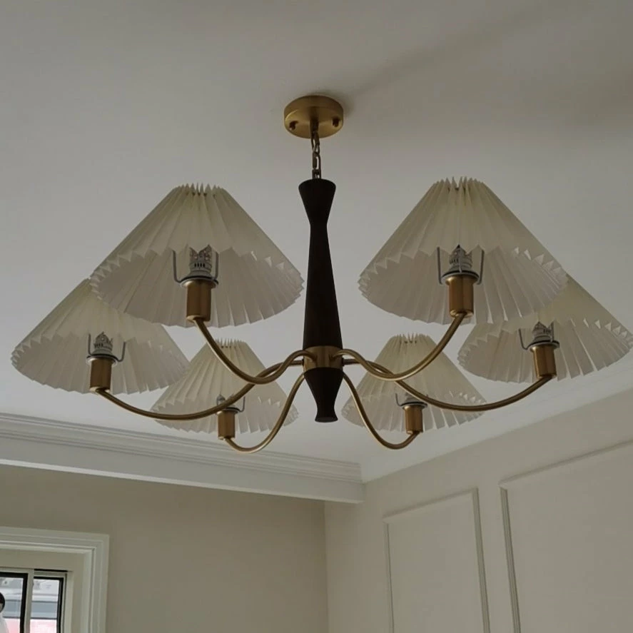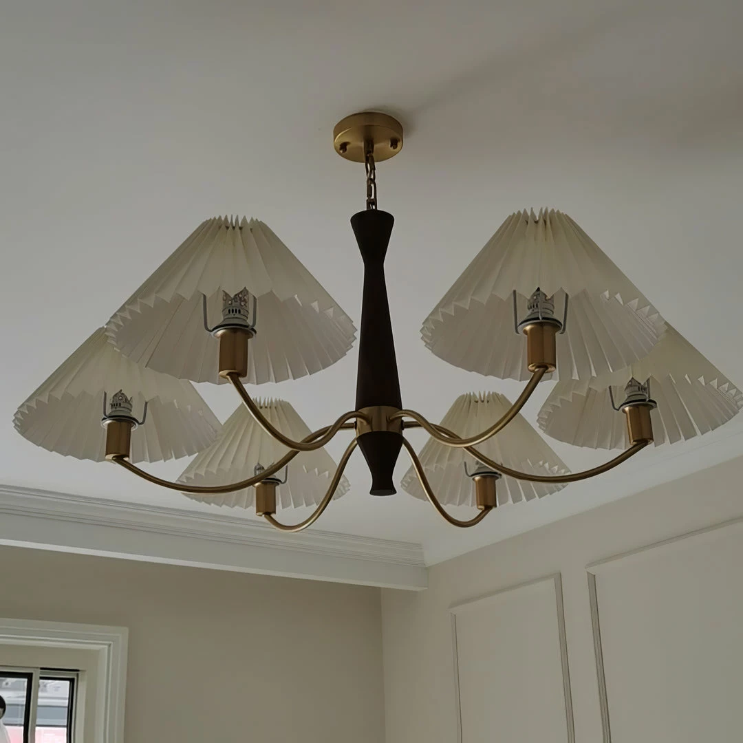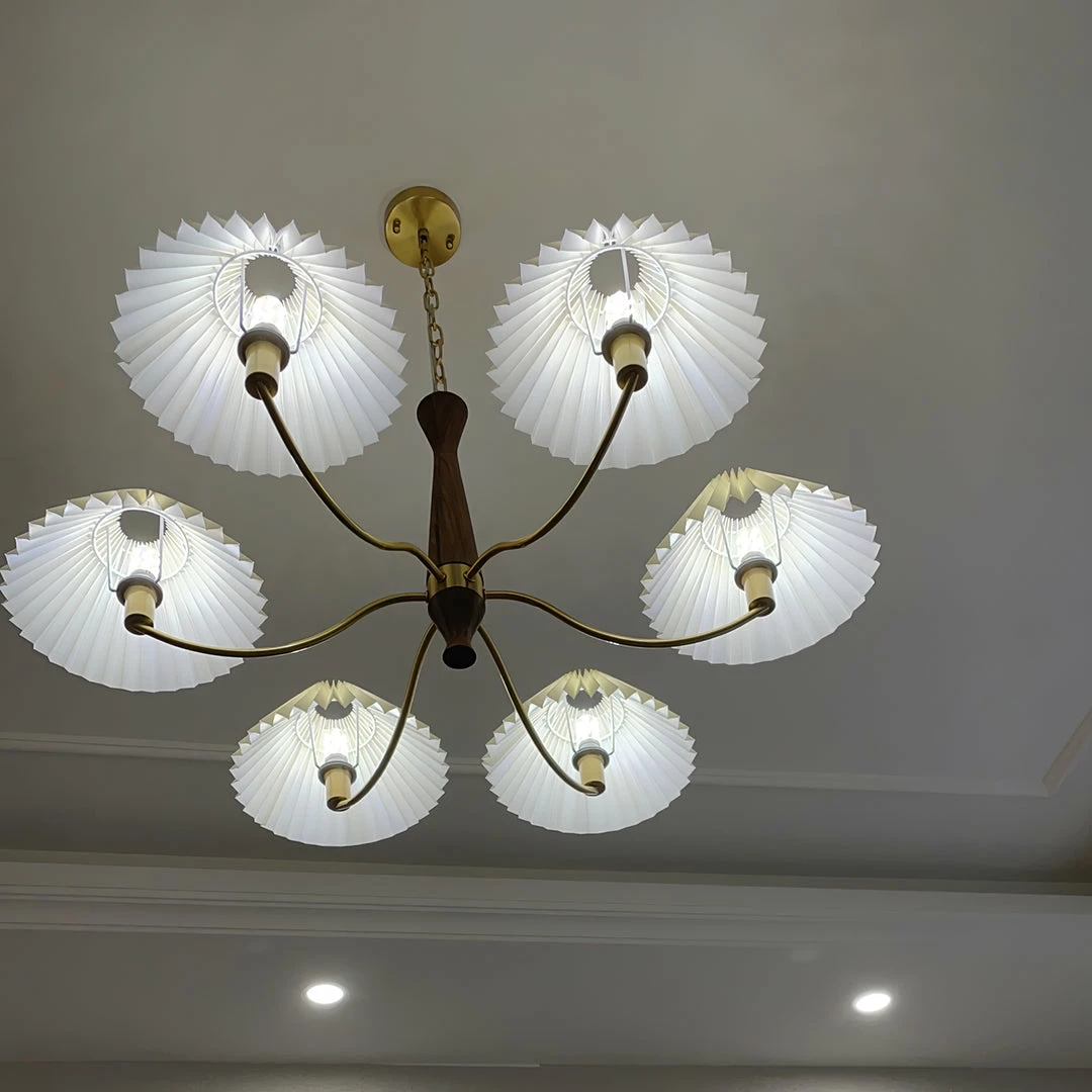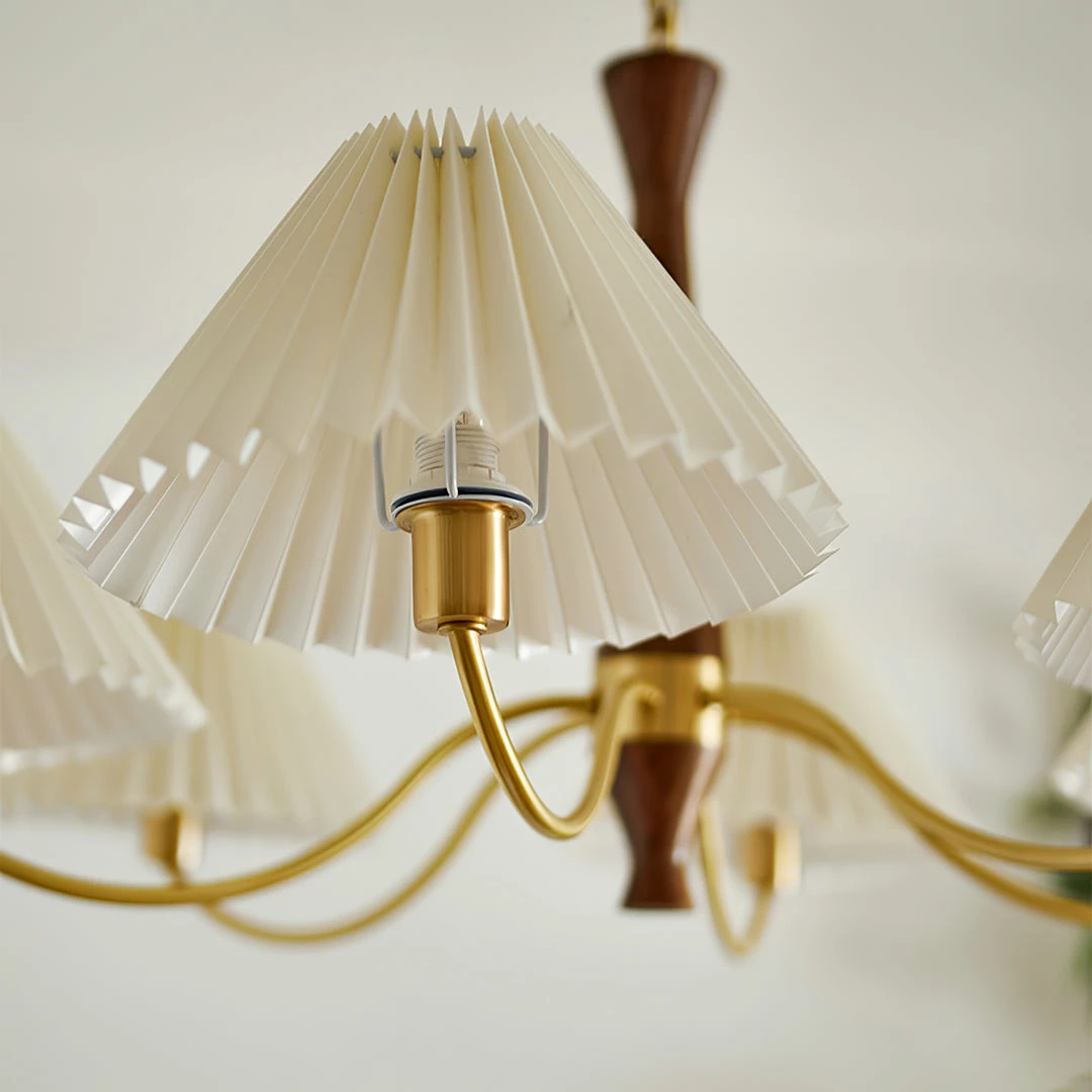 This chandelier impresses with its stylish design of curved arms and minimalist details. Its White pleated lampshade in an look skilfully round off the overall picture.