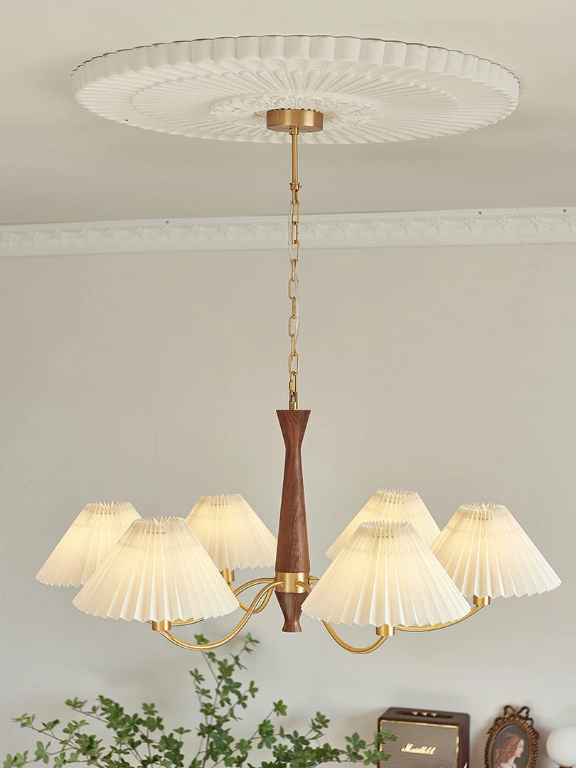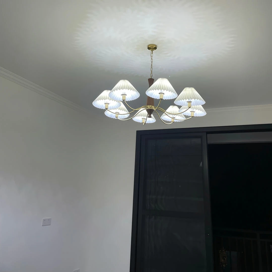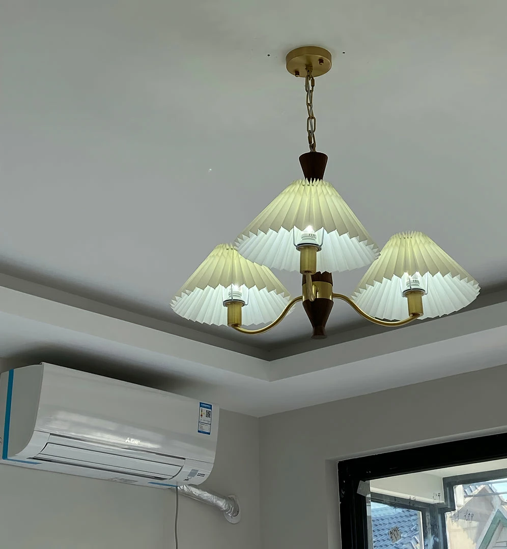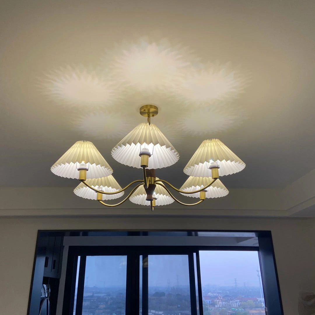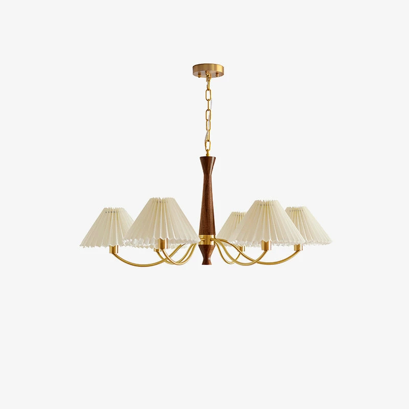 This chandelier impresses with its stylish design of curved arms and minimalist details. Its White pleated lampshade in an look skilfully round off the overall picture.