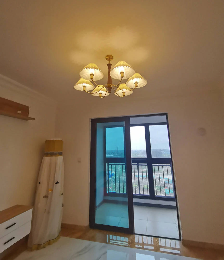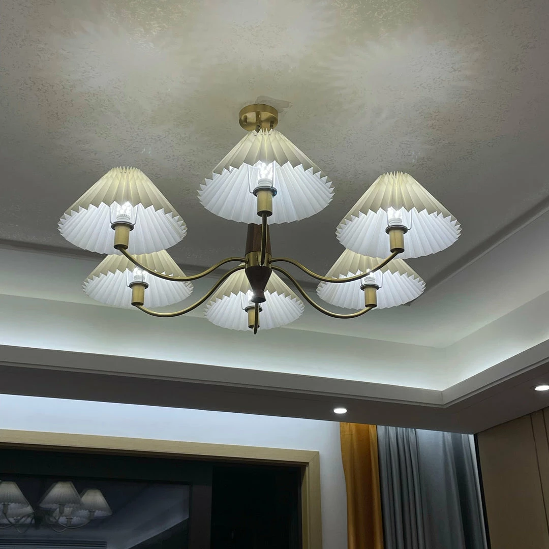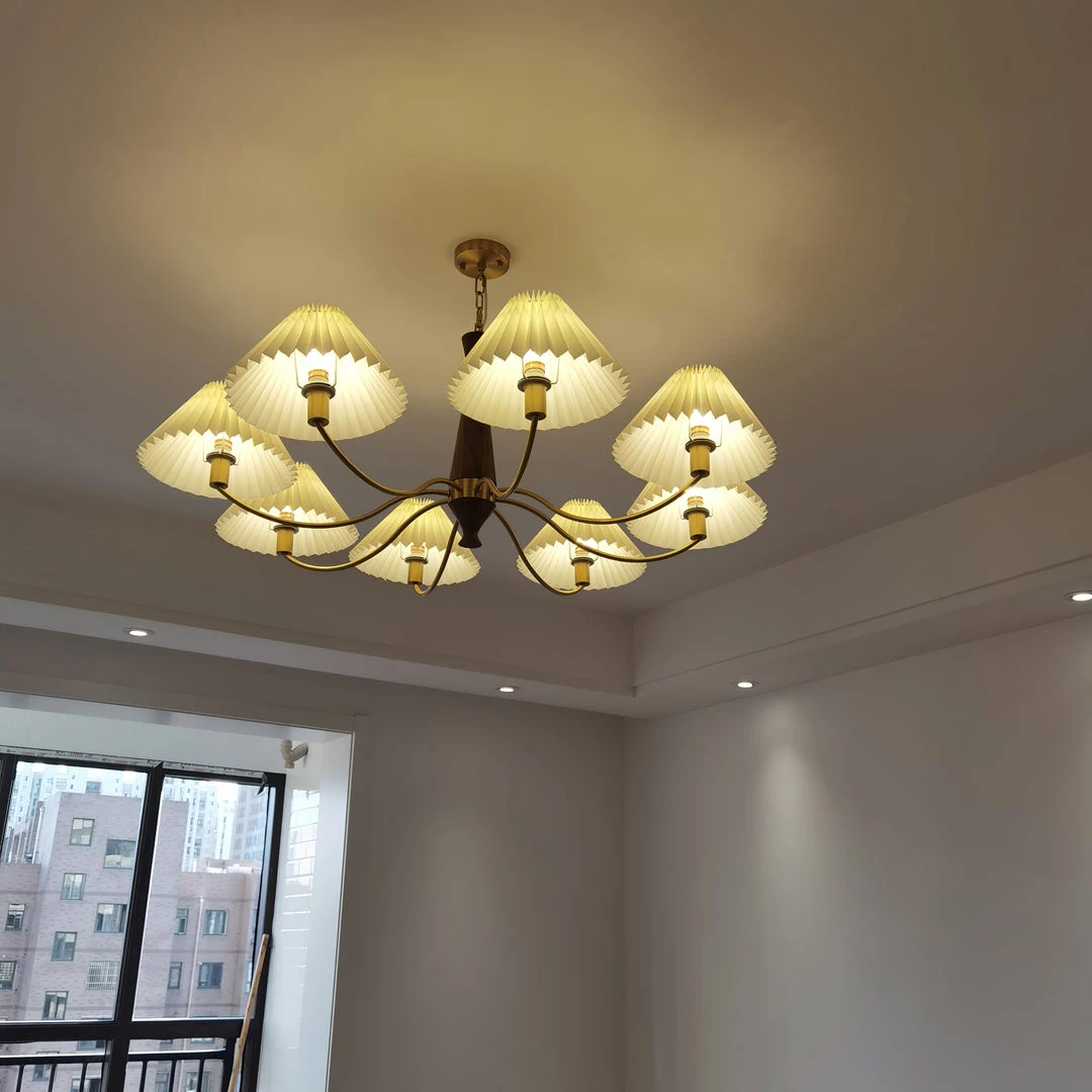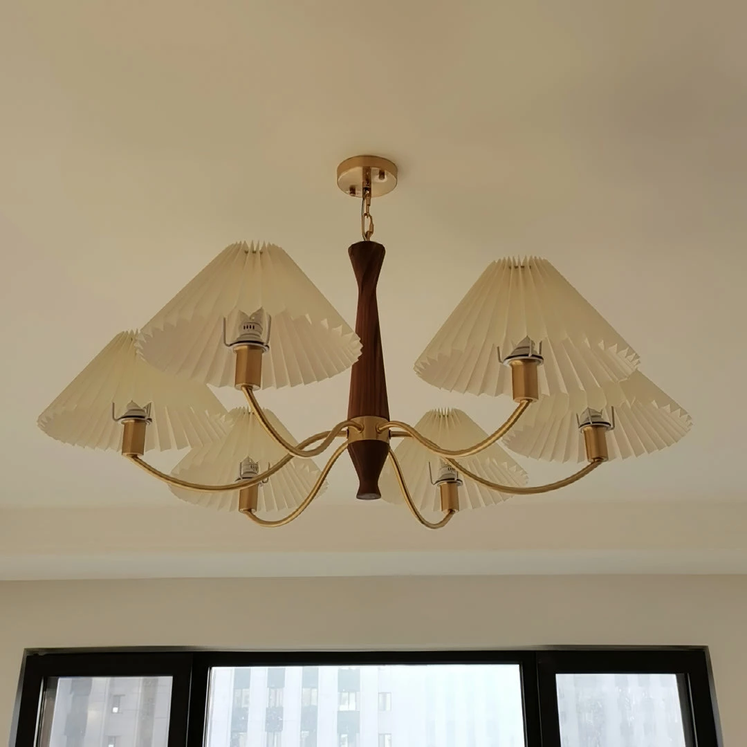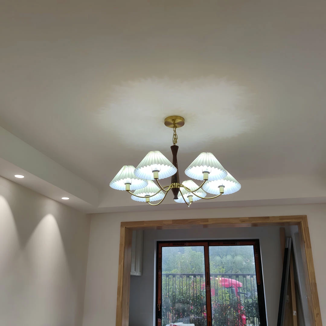 This chandelier impresses with its stylish design of curved arms and minimalist details. Its White pleated lampshade in an look skilfully round off the overall picture.