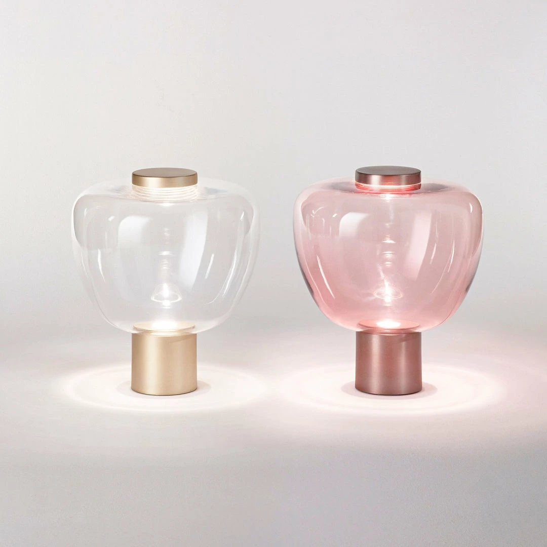 The simplicity and lightness of glass become the main features in three different sinuous shapes enriched by crystal, smoke, amber and light amethyst tones.