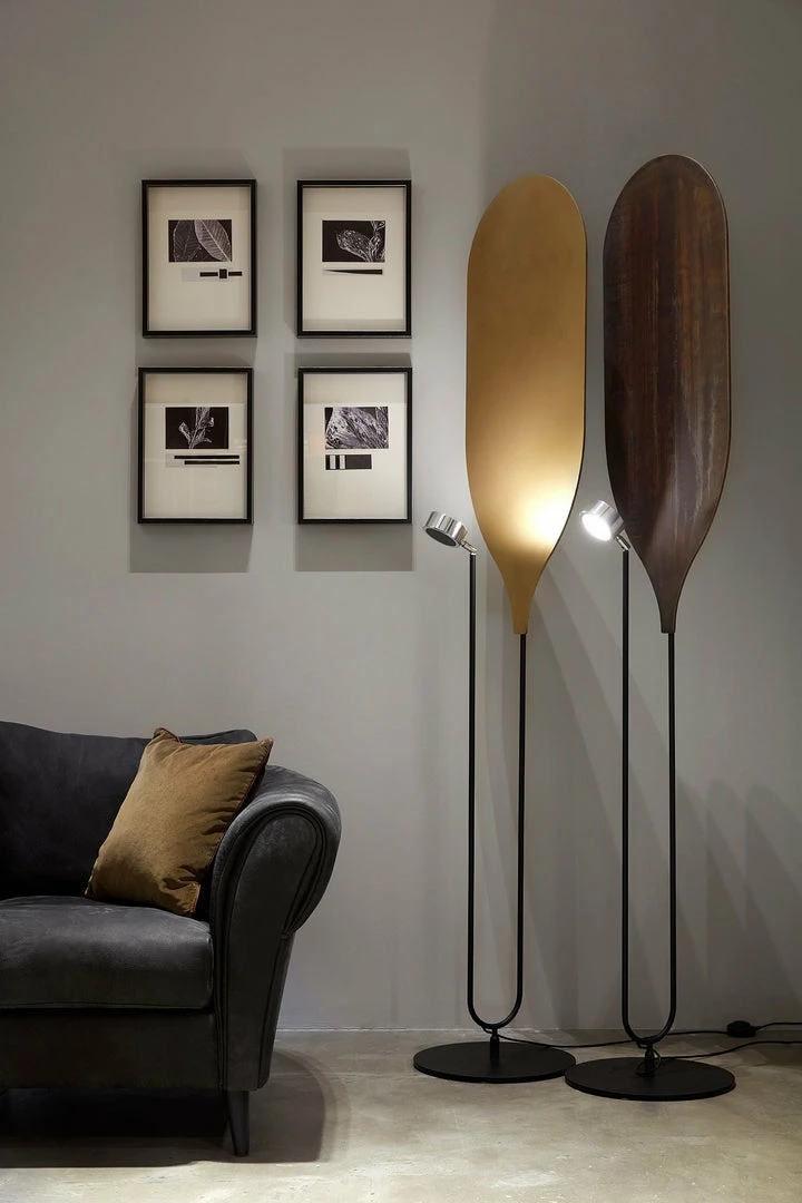 A panel in oxidised copper, with hand-applied patina finish, reflects an adjustable light that allows one to control the variation of light. It can be categorised as a reading lamp or a sculpture.