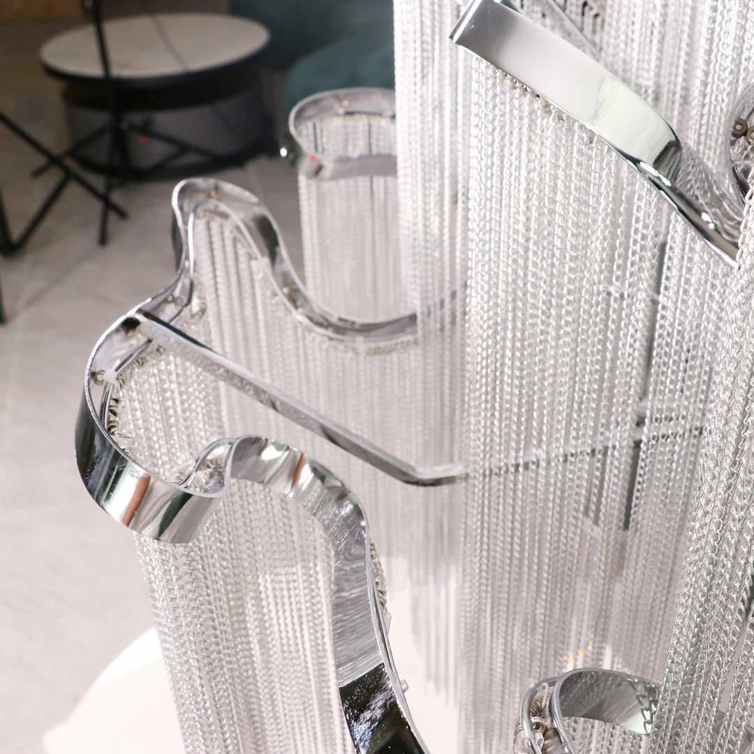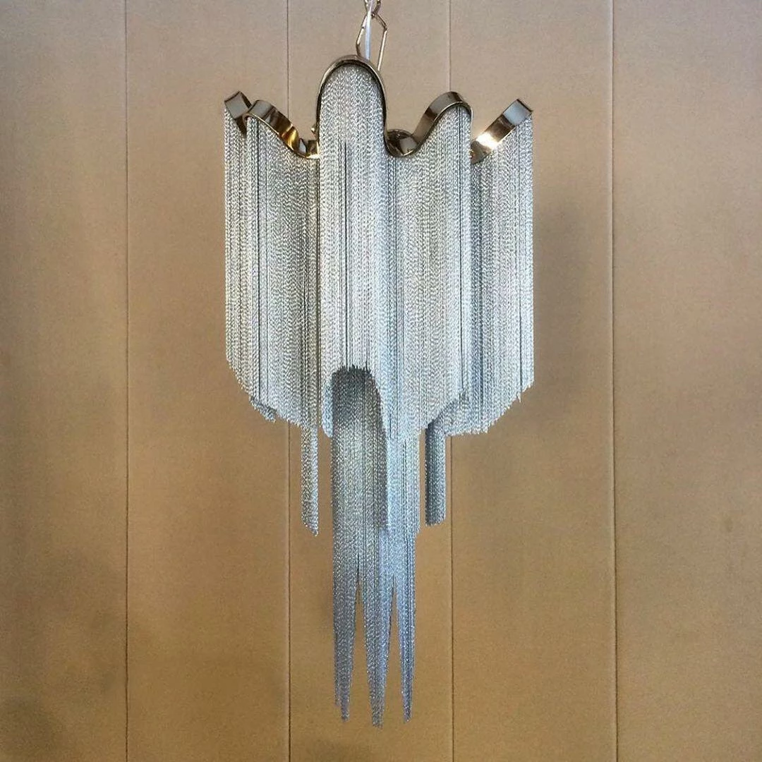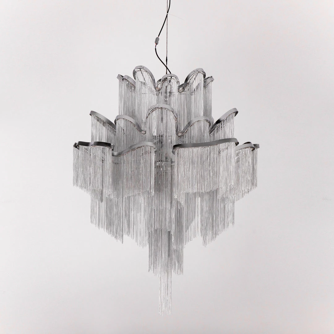 Another stunning design from Christian Lava, Stream is an impressive presence in any room. Like Christianโs other work for Terzani, Etoile, Streamโs design exploits the physical characteristics of the materials used to envelop a room in a unique, immersive light. Here, over seven kilometers of metal chain appear to flow down from the undulating, nickel-plated frame. These cascading tiers project a streaking, yet tranquil, shadow throughout the room. Design Christian Lava.