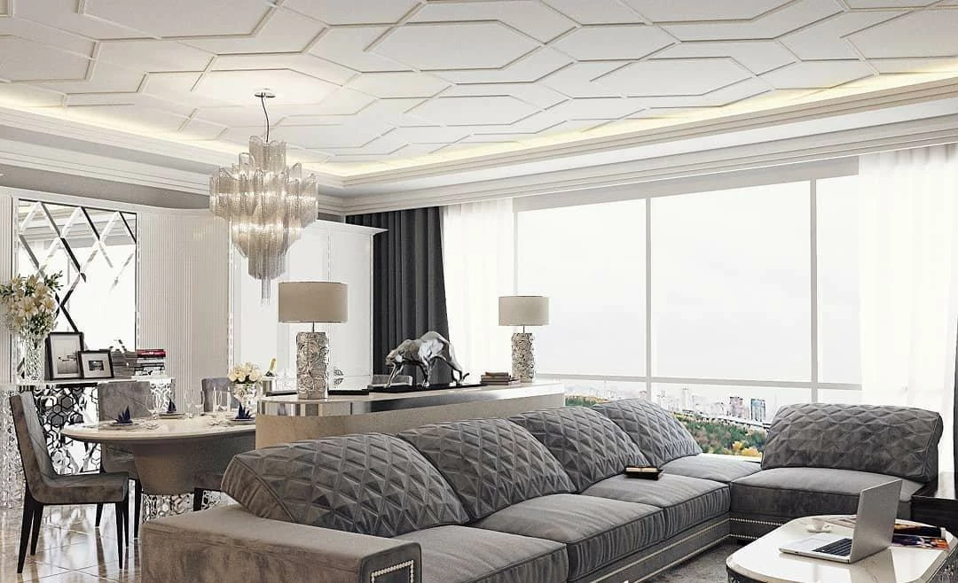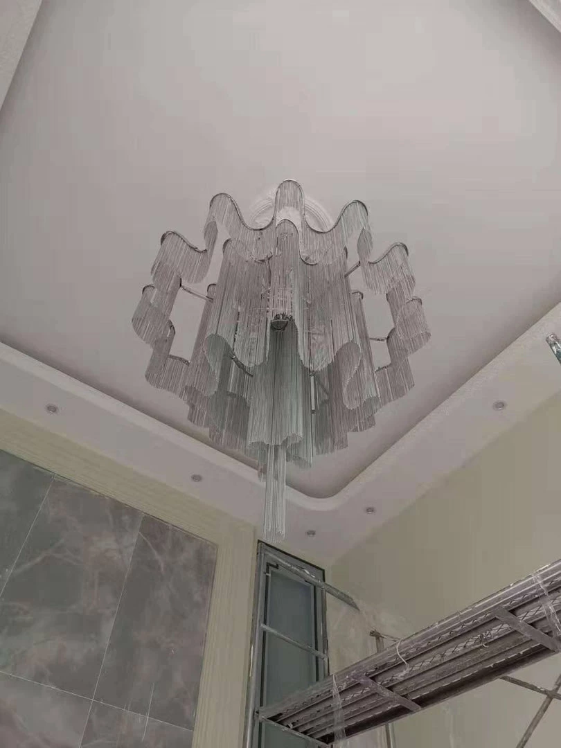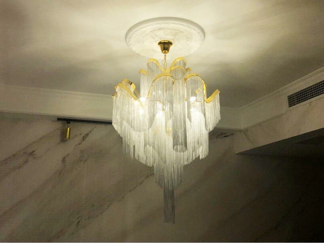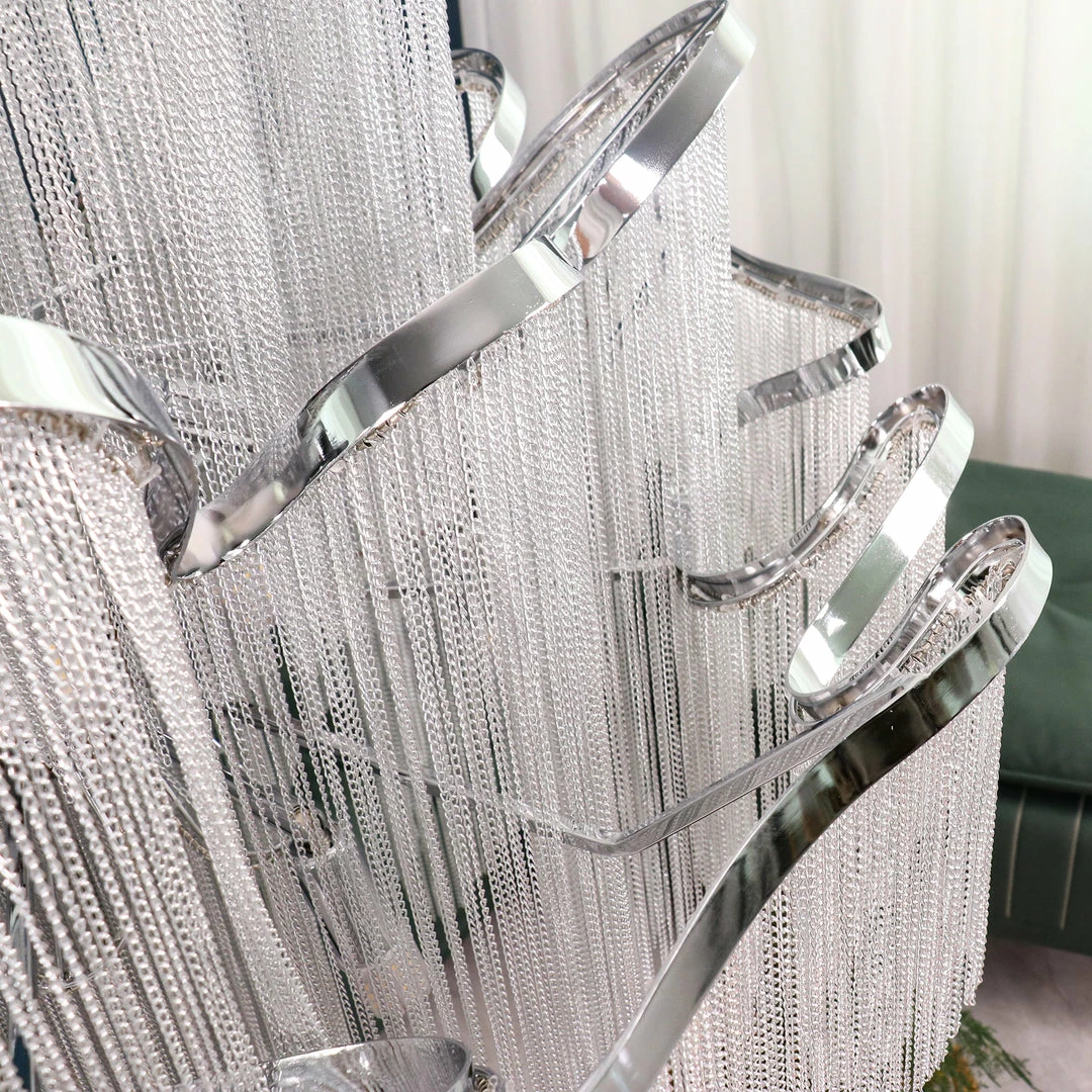 Another stunning design from Christian Lava, Stream is an impressive presence in any room. Like Christianโs other work for Terzani, Etoile, Streamโs design exploits the physical characteristics of the materials used to envelop a room in a unique, immersive light. Here, over seven kilometers of metal chain appear to flow down from the undulating, nickel-plated frame. These cascading tiers project a streaking, yet tranquil, shadow throughout the room. Design Christian Lava.