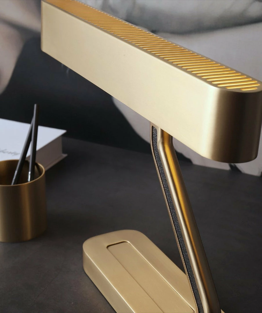 A machined brass grill lends an industrial feel to the sleek Colt Table Light. Featuring bronze inserts on the arm and opal diffusers for a soft, warm light, an inbuilt pen tray highlights we signature attention to detail.ย