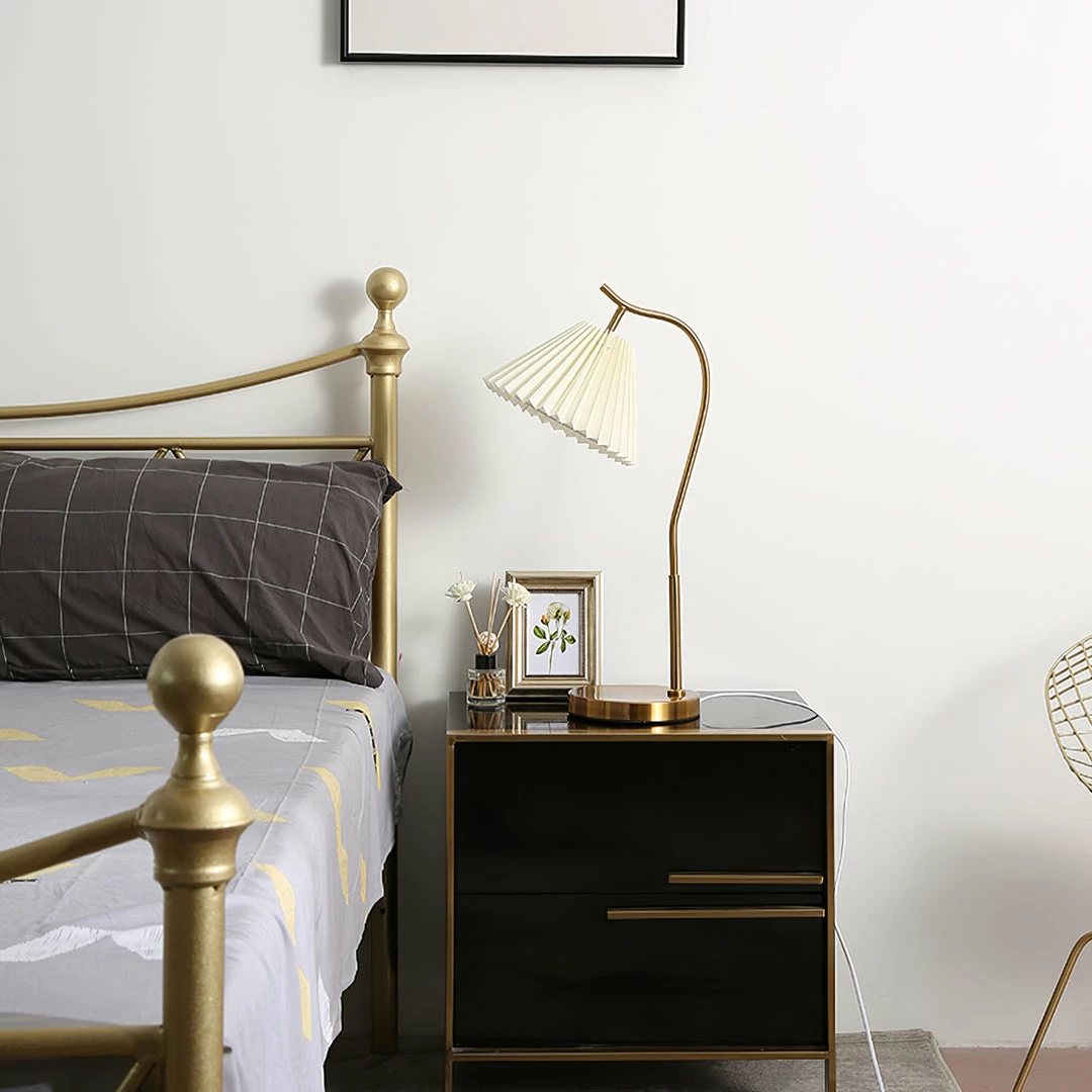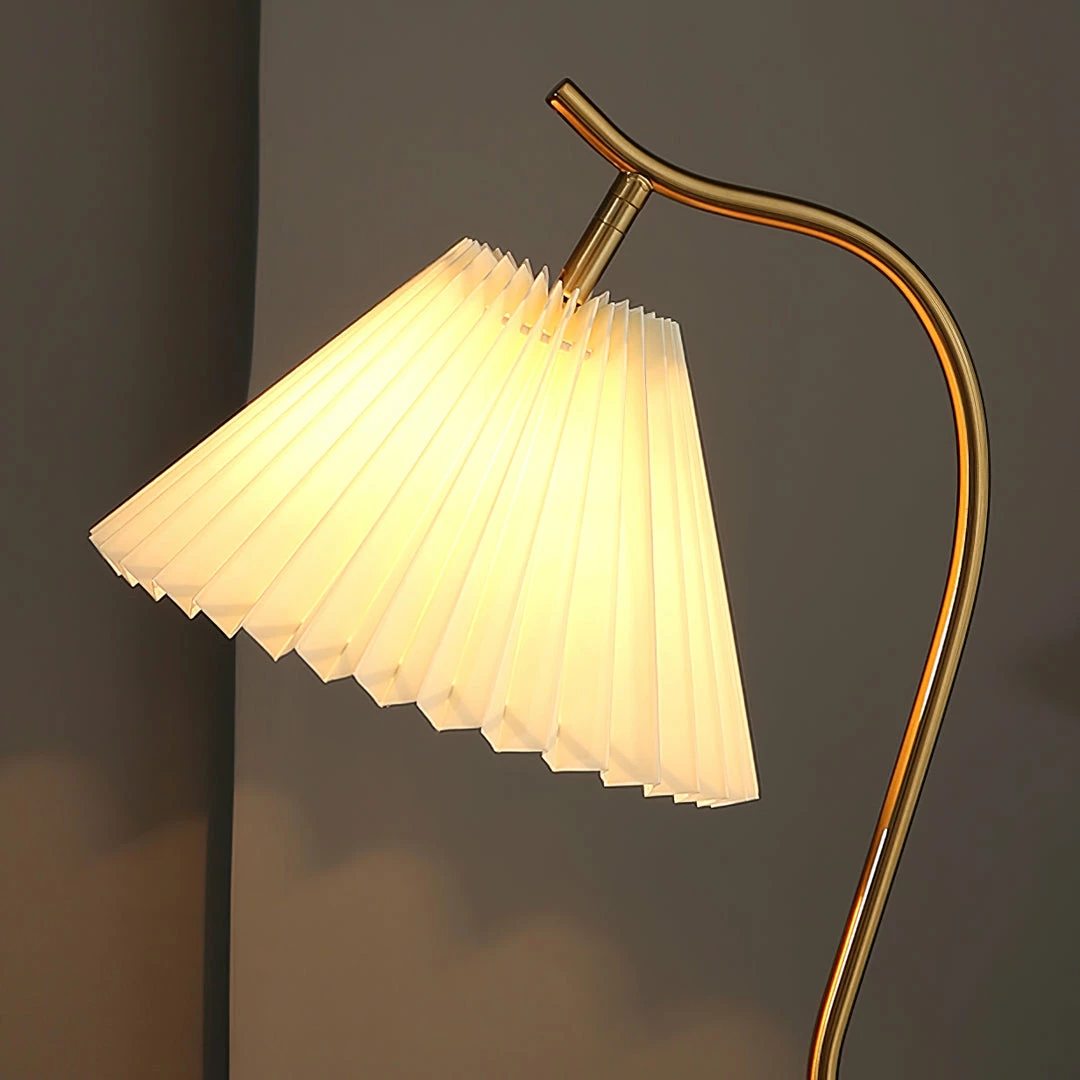 This beautiful table lamp is influenced by the Japandi style that brings together the exotic styles of Japan and Scandinavia. The pleated shade makes a beautiful contrast with the Iron base, creating a dรฉcor accent thatโs a fusion of function and delicate aesthetics. Plus, the shade is removable to conveniently replace the bulb or clean the lamp.