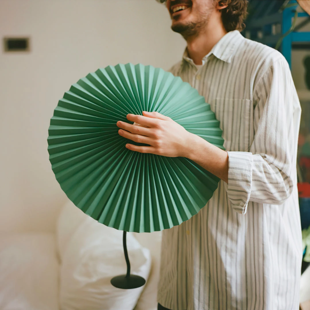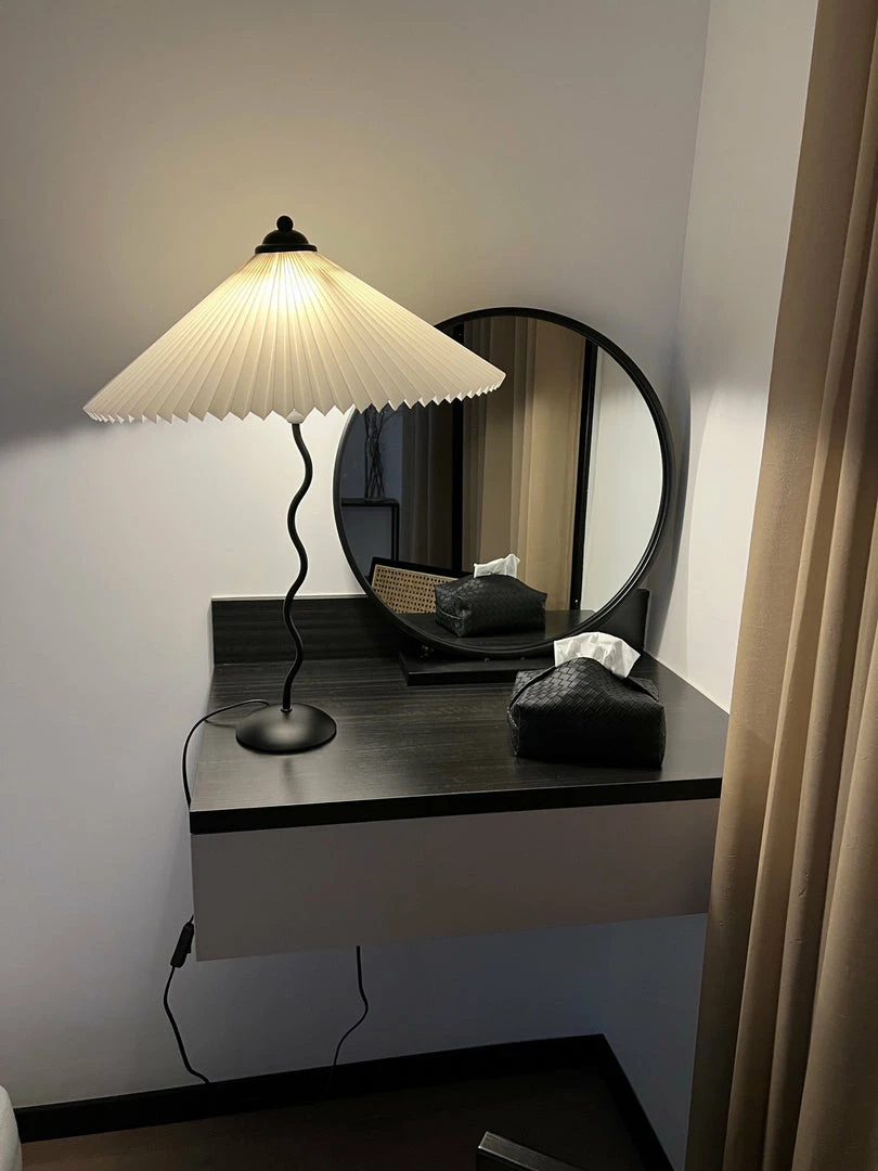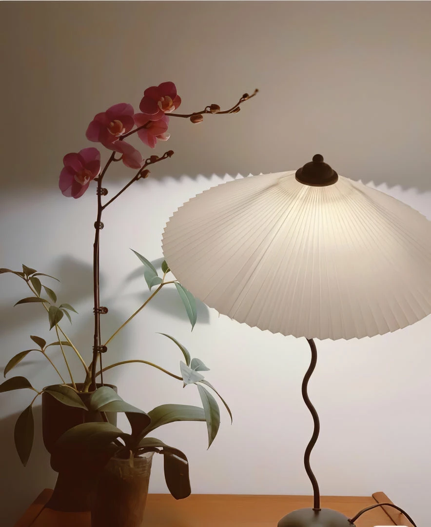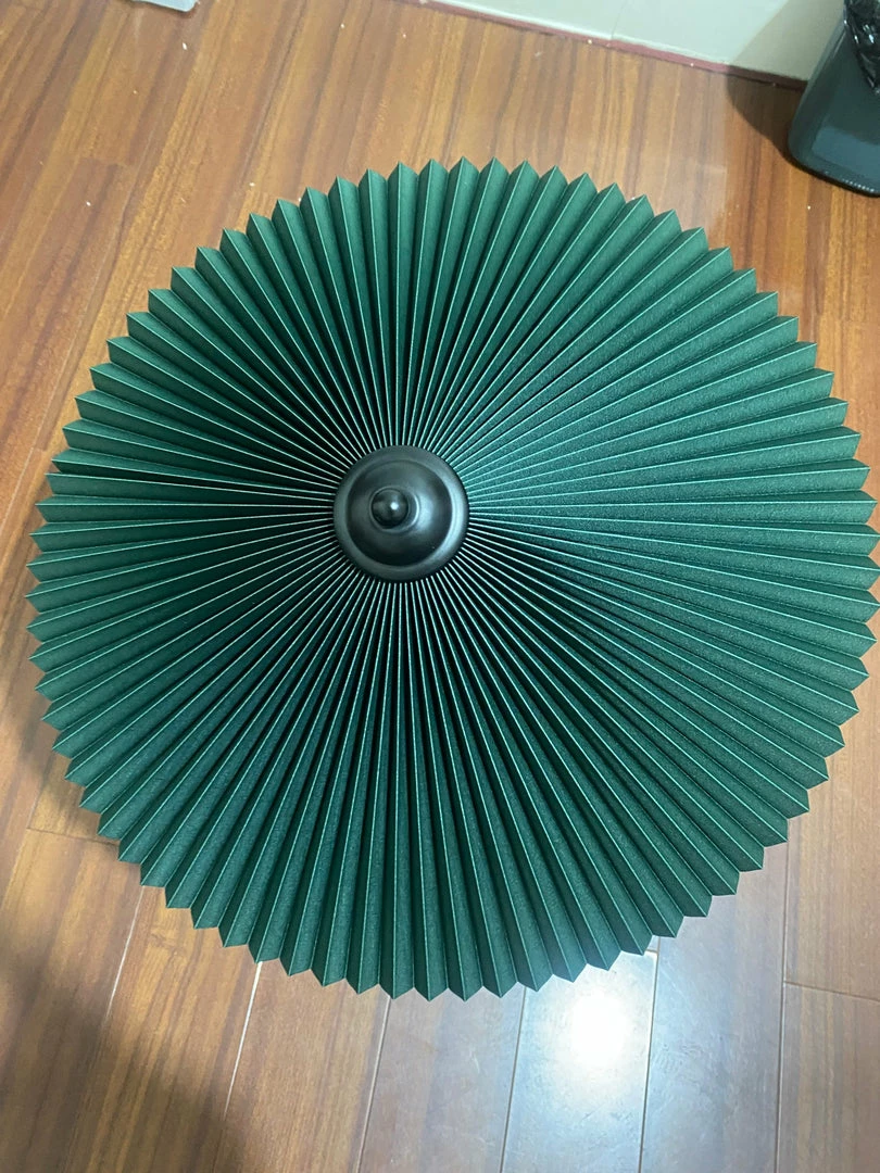 This lamp was inspired by a pleated hat/ old lampshade I found. The handcrafted Sicilian Iron base has been designed to complement the subtle lightness of the pleated lampshade. Measuring approximately 75cm in height with a cappello of 43cm in diameter, the lamp will need some basic assembly before use.ย