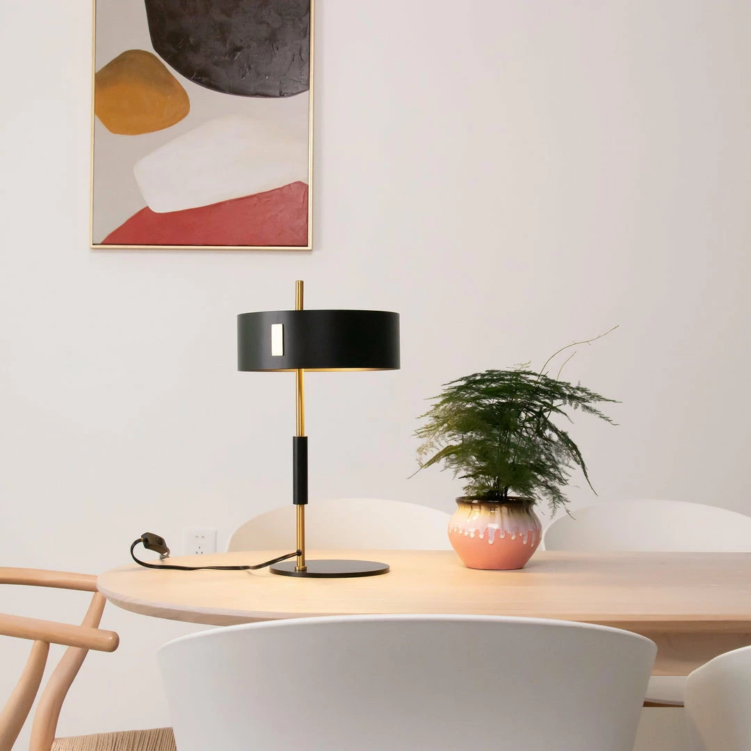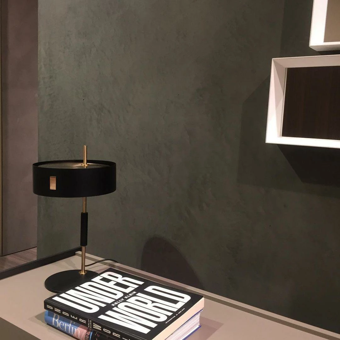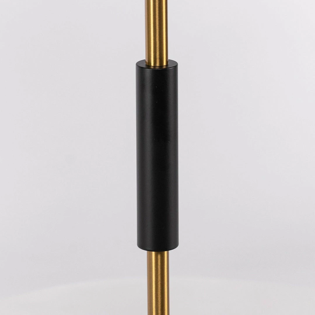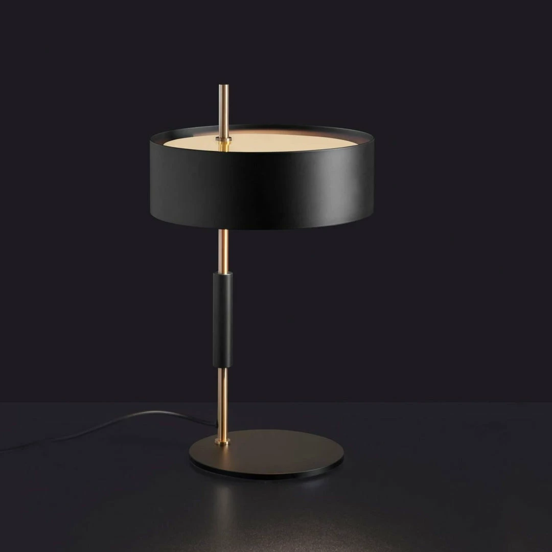 The lamp 1953 designed, by Ostuni e Forti, has two models, floor and table, varying in proportion and size but identical in their design which shifts the whole lampshade section from the centre to the side. A range that elegantly recalls the style of those years, such as the use of a shade in the classic cylindrical shape and the fine contrast of the satin gold – stem and shade’s interior – against the black – the exterior of the shade, the base and the stem grip.