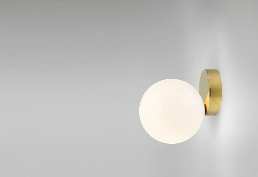 The Tip Of The Tongue table lamp by Michael Anastassiades is made from cast brass and is available in either polished brass or polished nickel-plated brass. The opaline sphere is blown glass.