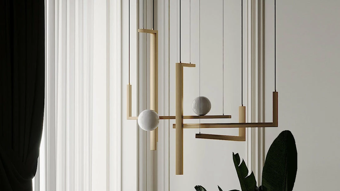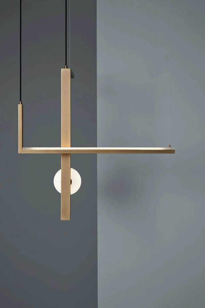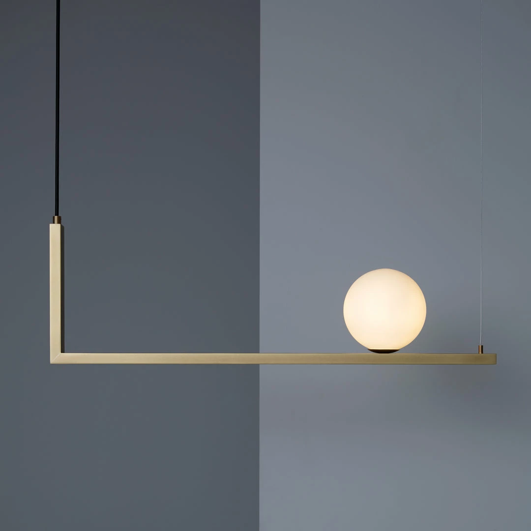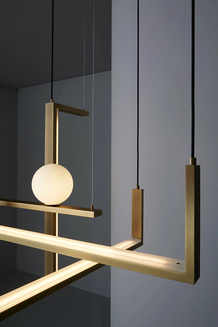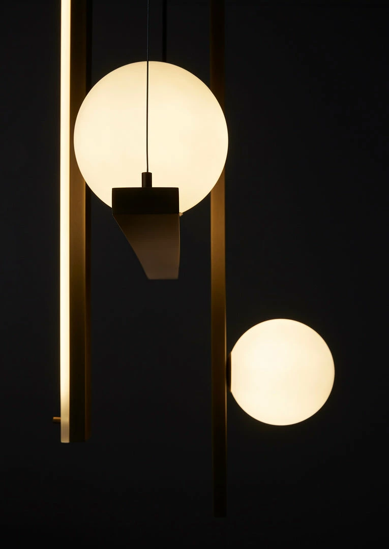 Suspended lamp with diffused light.Consists of wrought iron profiles, blown glass balls and acrylic diffuser.Self-supporting black fabric cords and steel cables with rapid fixing system.