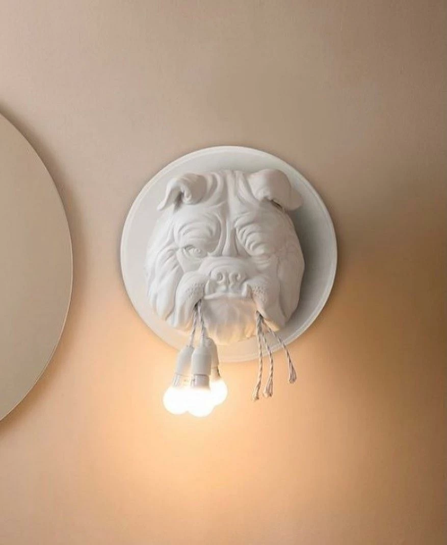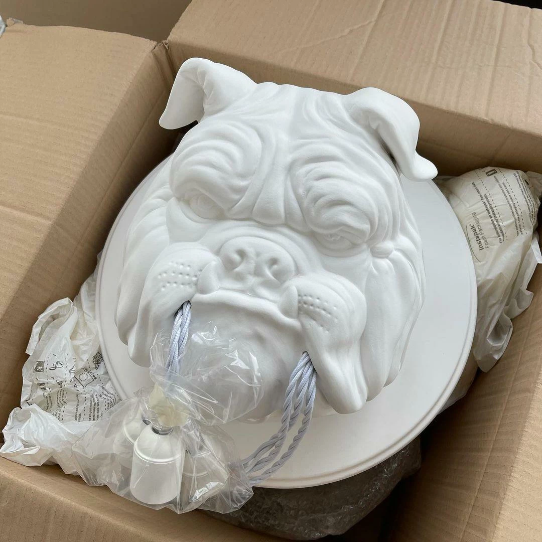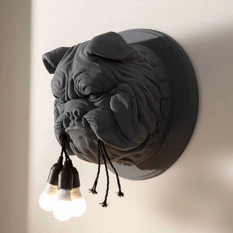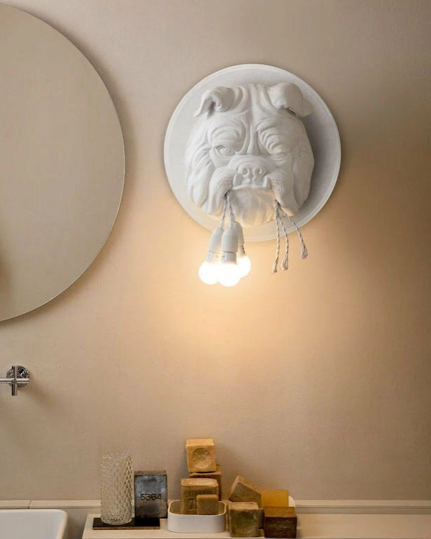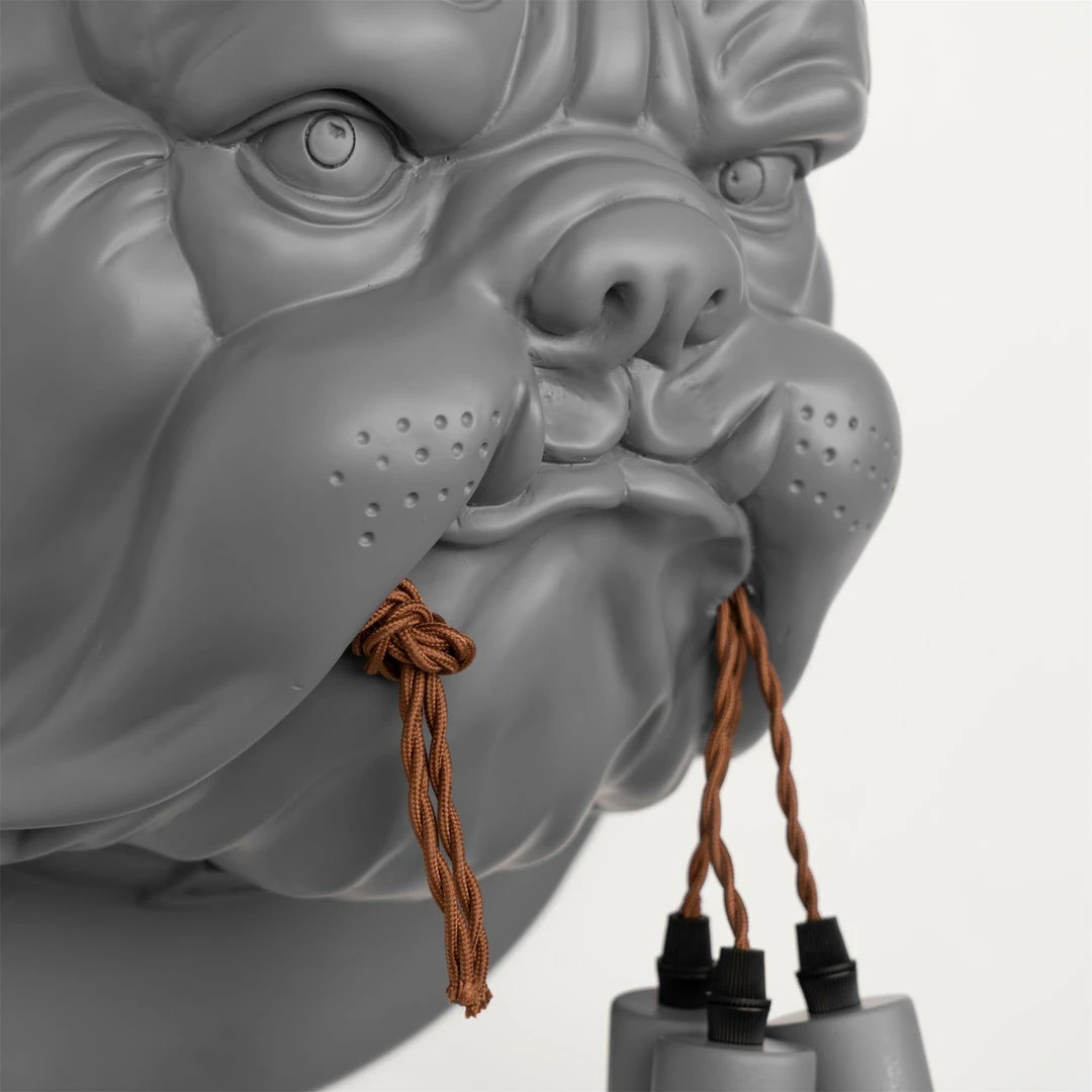 The Amsterdam Wall Sconce is part of a series of pieces that examine nature’s relationship to man. this fixture showcases the bust of an expressive bulldog rising from the wall to hold a ripped cluster of light bulbs in his mouth. Its resin composition adds to its structural detailing while the smooth matte finish lends a classic element. The light bulbs emit a warm glow that highlights the fine details within the bulldog’s angered expression.