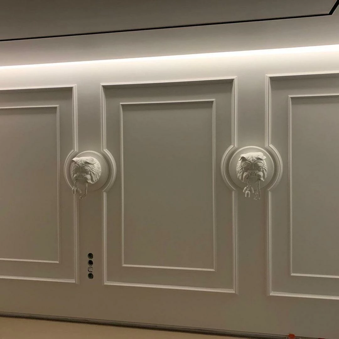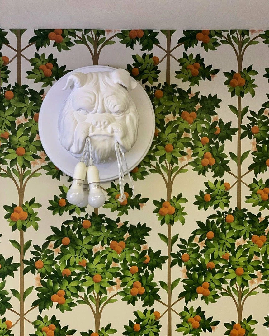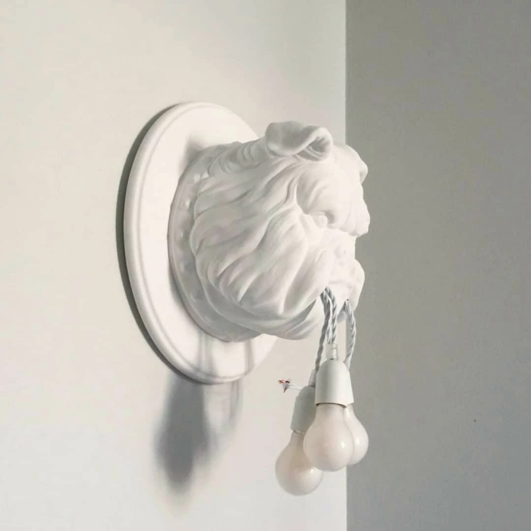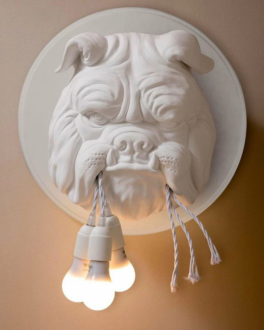 The Amsterdam Wall Sconce is part of a series of pieces that examine nature’s relationship to man. this fixture showcases the bust of an expressive bulldog rising from the wall to hold a ripped cluster of light bulbs in his mouth. Its resin composition adds to its structural detailing while the smooth matte finish lends a classic element. The light bulbs emit a warm glow that highlights the fine details within the bulldog’s angered expression.