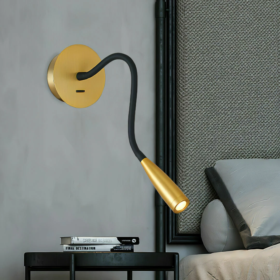 That Sconce can provide additional lighting in the bedroom or living room as a reading lamp. With the rotary head can be directed in the desired beam direction. A gold round hose LED reading wall light with a USB plug to charge your phone.