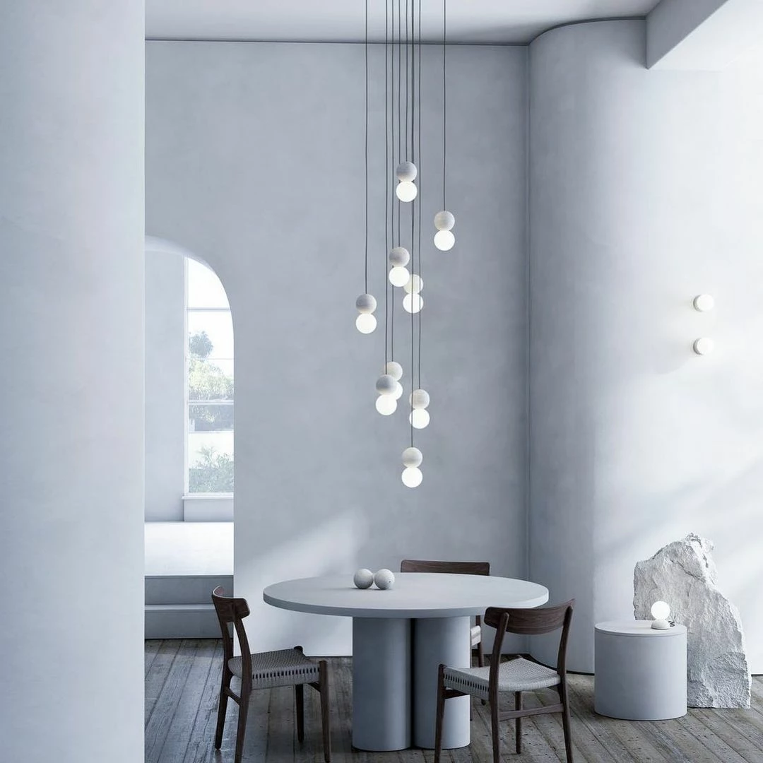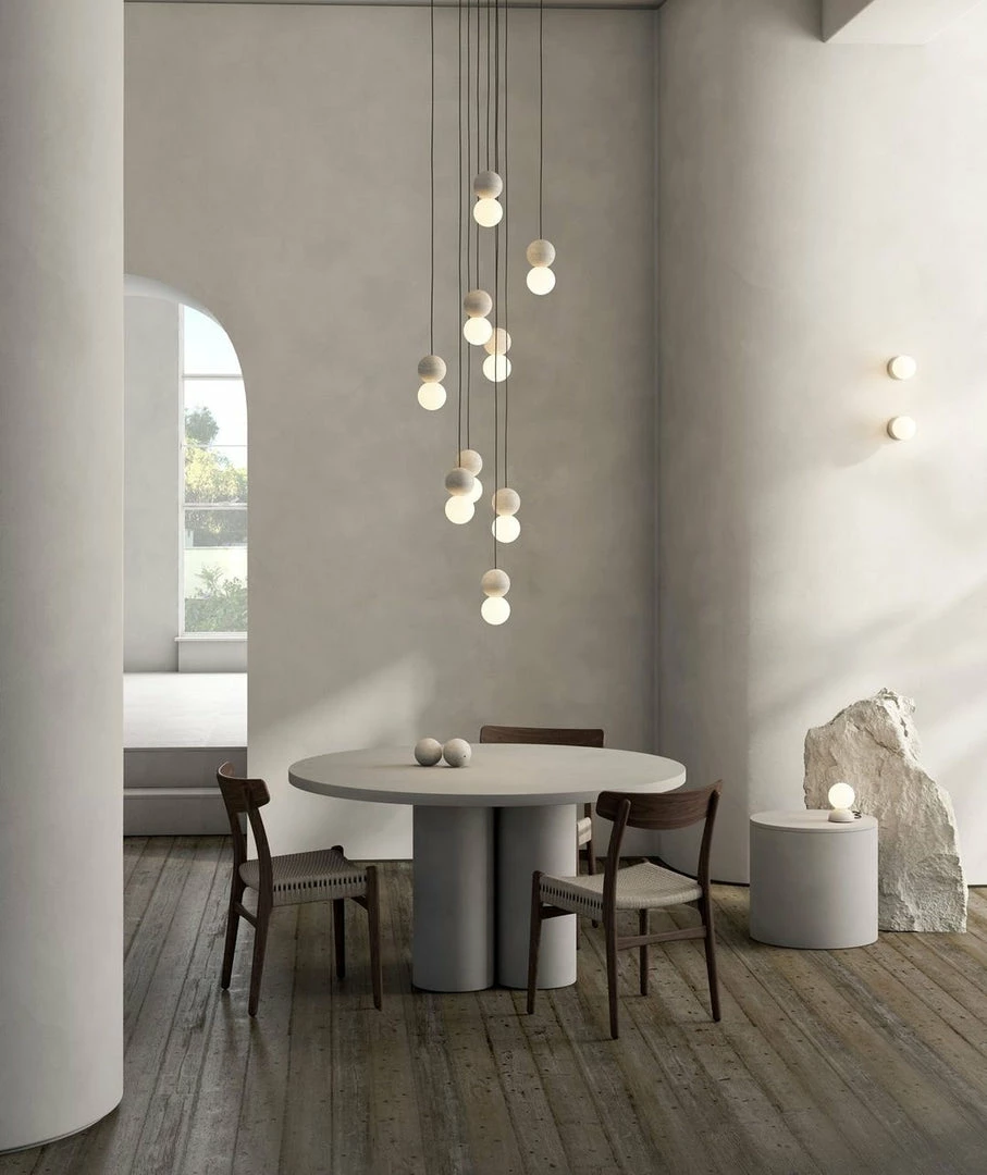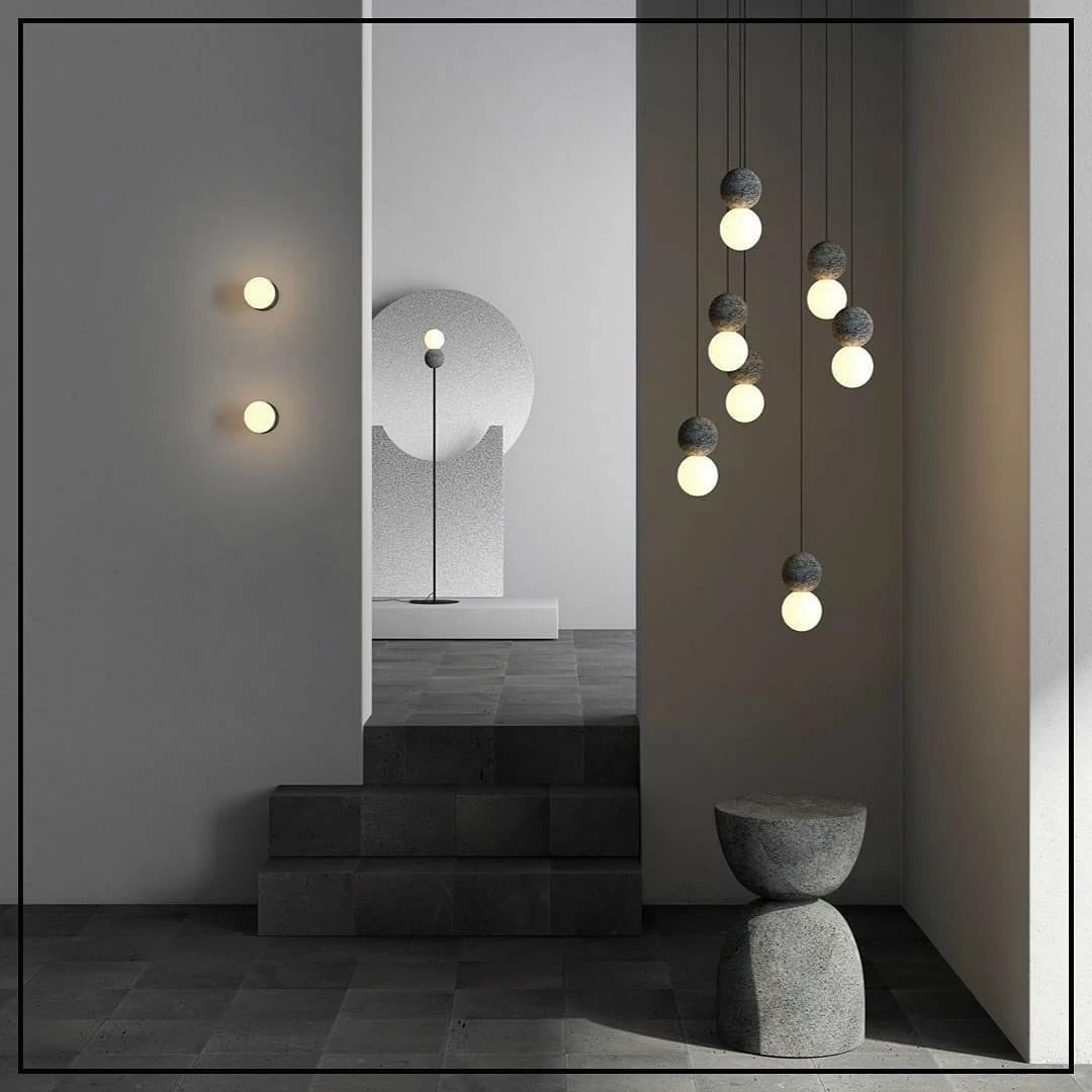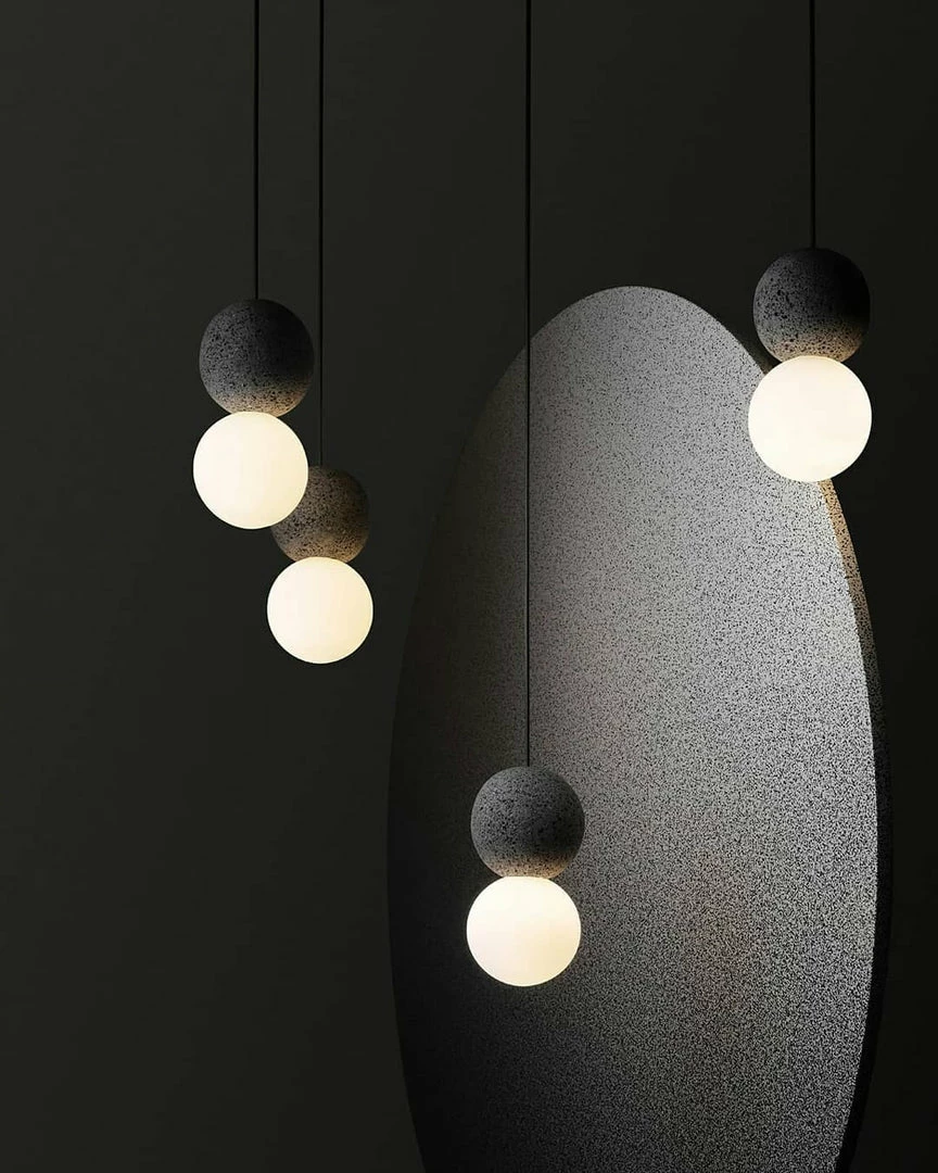 Geometry in its purest form. Origo embodies opposite essences mirroring volcanic rock and an opal glass diffuser. An exploration of interaction, light shining onto the texture of the volcanic rock, revealing its relief and contour. Sober and logical, both materials create a relationship between light and composition. Balance in its essence, lightness and heaviness expressed through a timeless piece. Spheres work as a double geometry, mirroring positive and negative. Reinforce the fundamental relationship between light and shadows.