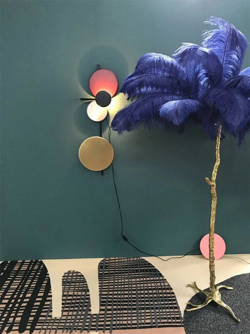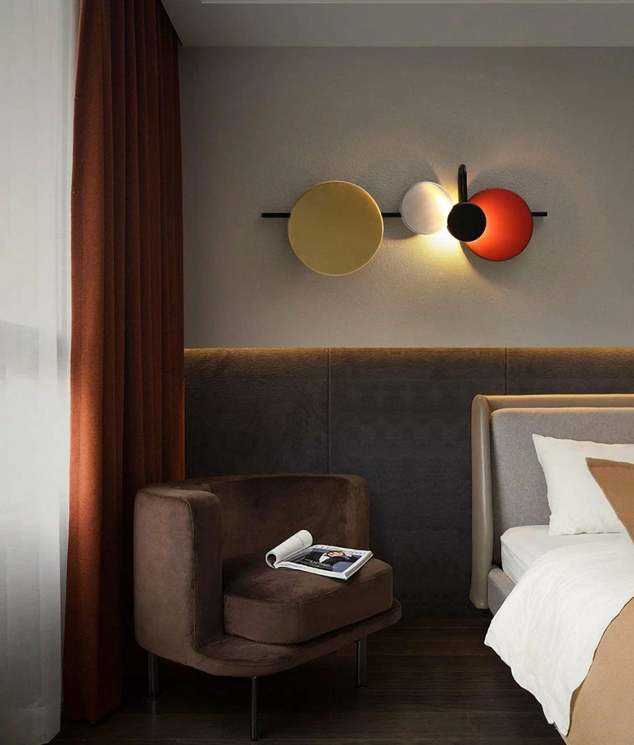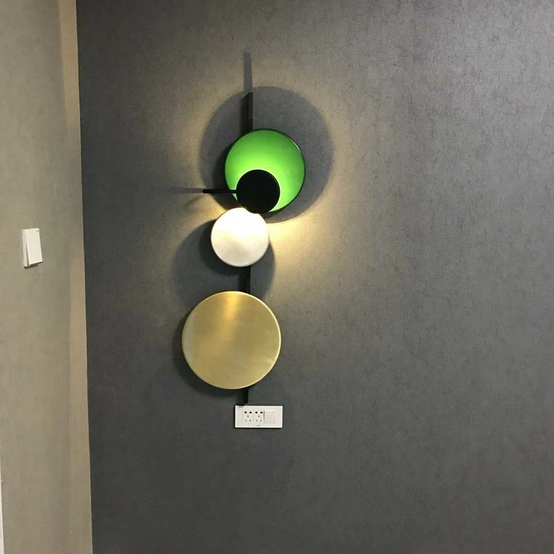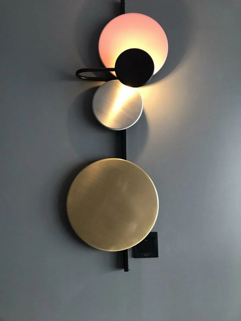 Planet Lamp is a wall hanging lamp that reflects light. The indirect ambient light appears soft and creates light and shadows on the wall according to how the circular disks are placed. The disks have magnets and can freely be moved around on the vertical steel bar. The variation in material, surface and size of the disks gives the opportunity to set the light as desired.