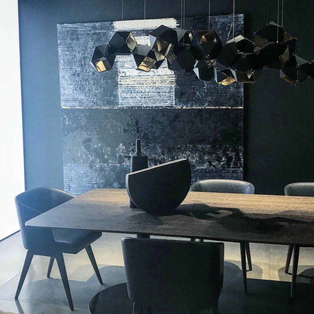A fixture of metallic proportion, the signature WELLES is a modern piece that showcases expert artistry. Hollowed metallic polygons branch out into a modular system of interconnected configurations for a stunning optical illusion. With its endless possibilities, the WELLES floats in the air emitting a cloud of soft light through its multifaceted, sculpturally innovative silhouette.